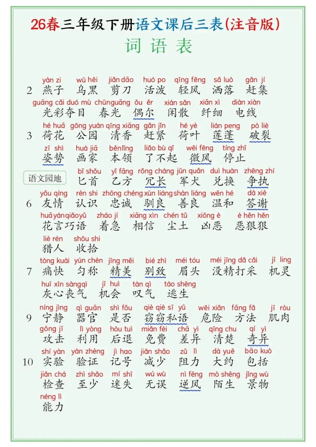 寒假语文打卡不用愁,这份资料就够孩子用。26春三年级下册课后三表注音版,8页可打印电子版,内容贴合课本。每天花几分钟读一读,生字词语记得牢,预习一步到位。