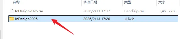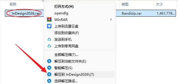 1.解压安装包:鼠标右击【InDesign 2026】压缩包,选择电脑上安装的解压软件,点击【解压到InDesign 2026】。
