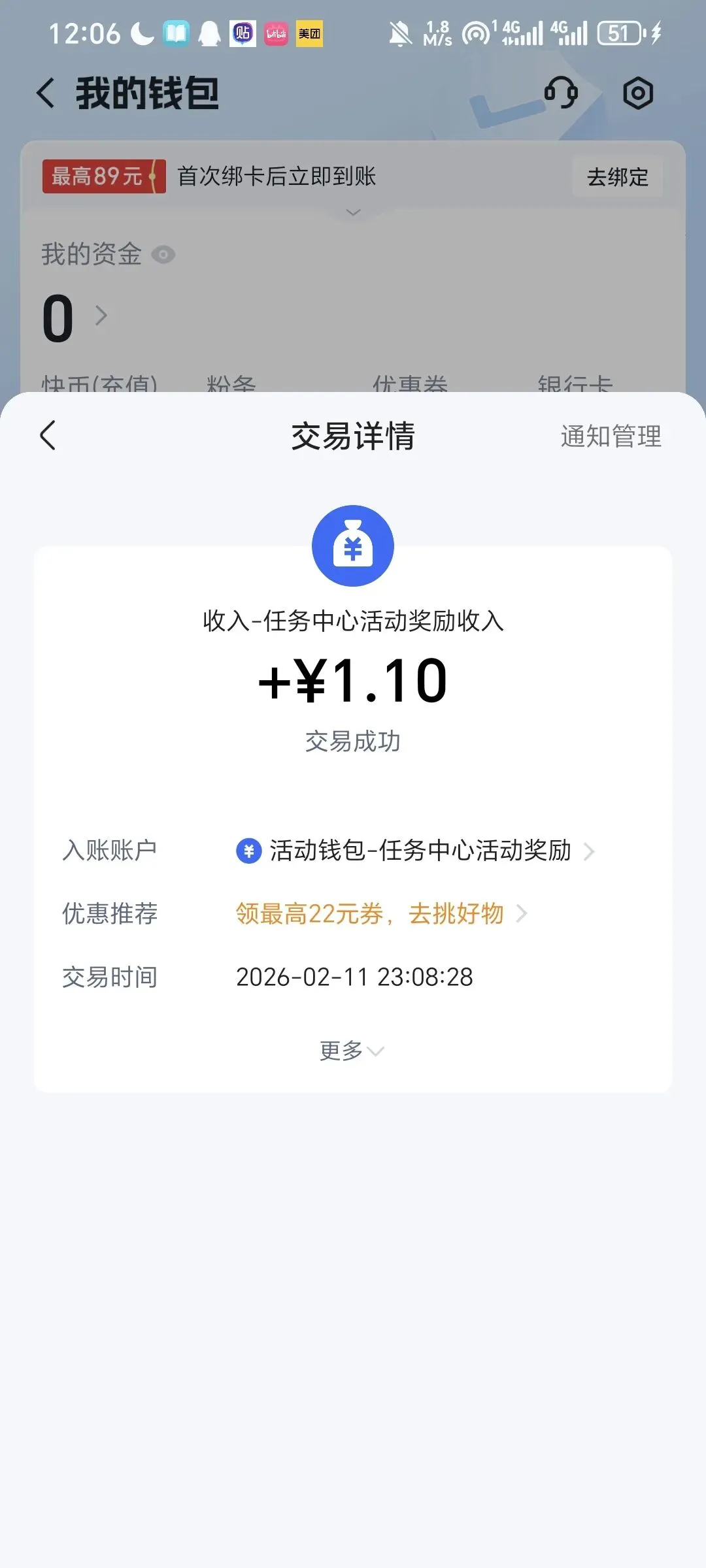 快手这个啥活动记不太清楚了。快手合计收入1.10。