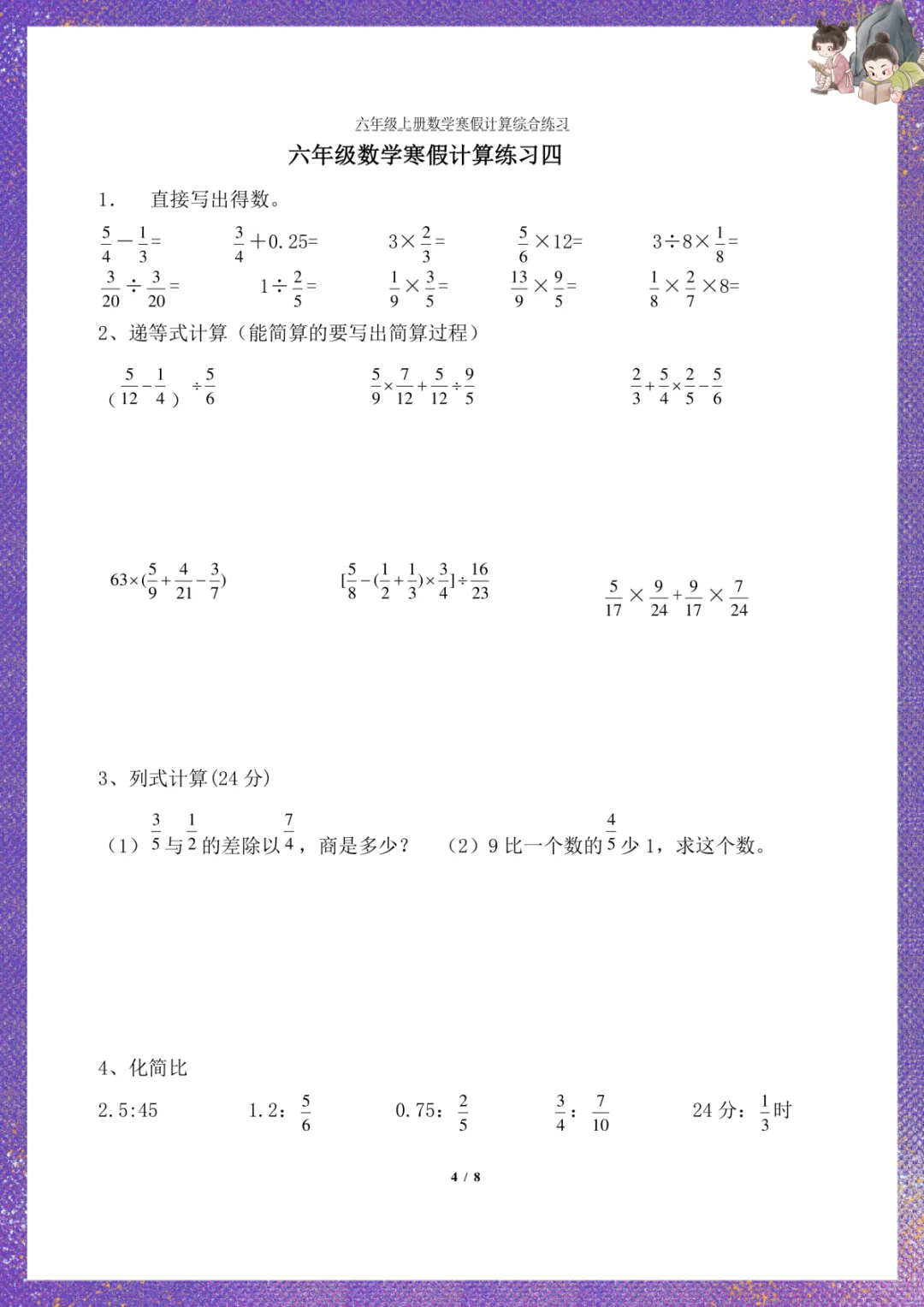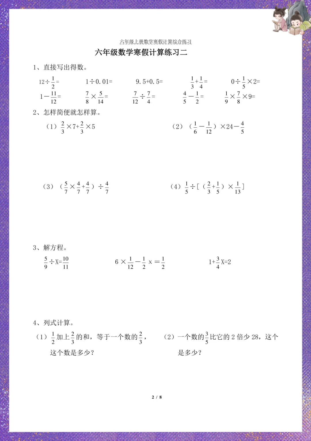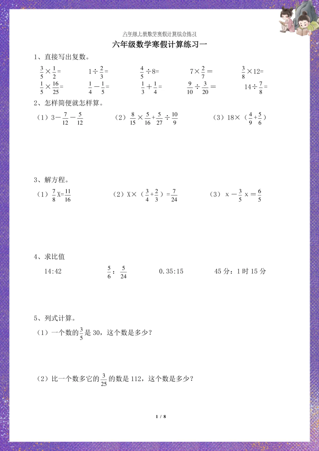 六年级上册数学:寒假计算综合练习 电子版可下载打印