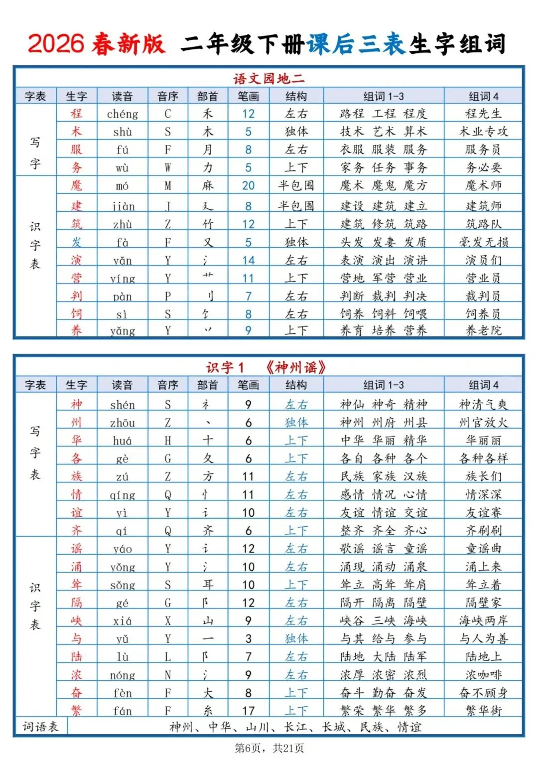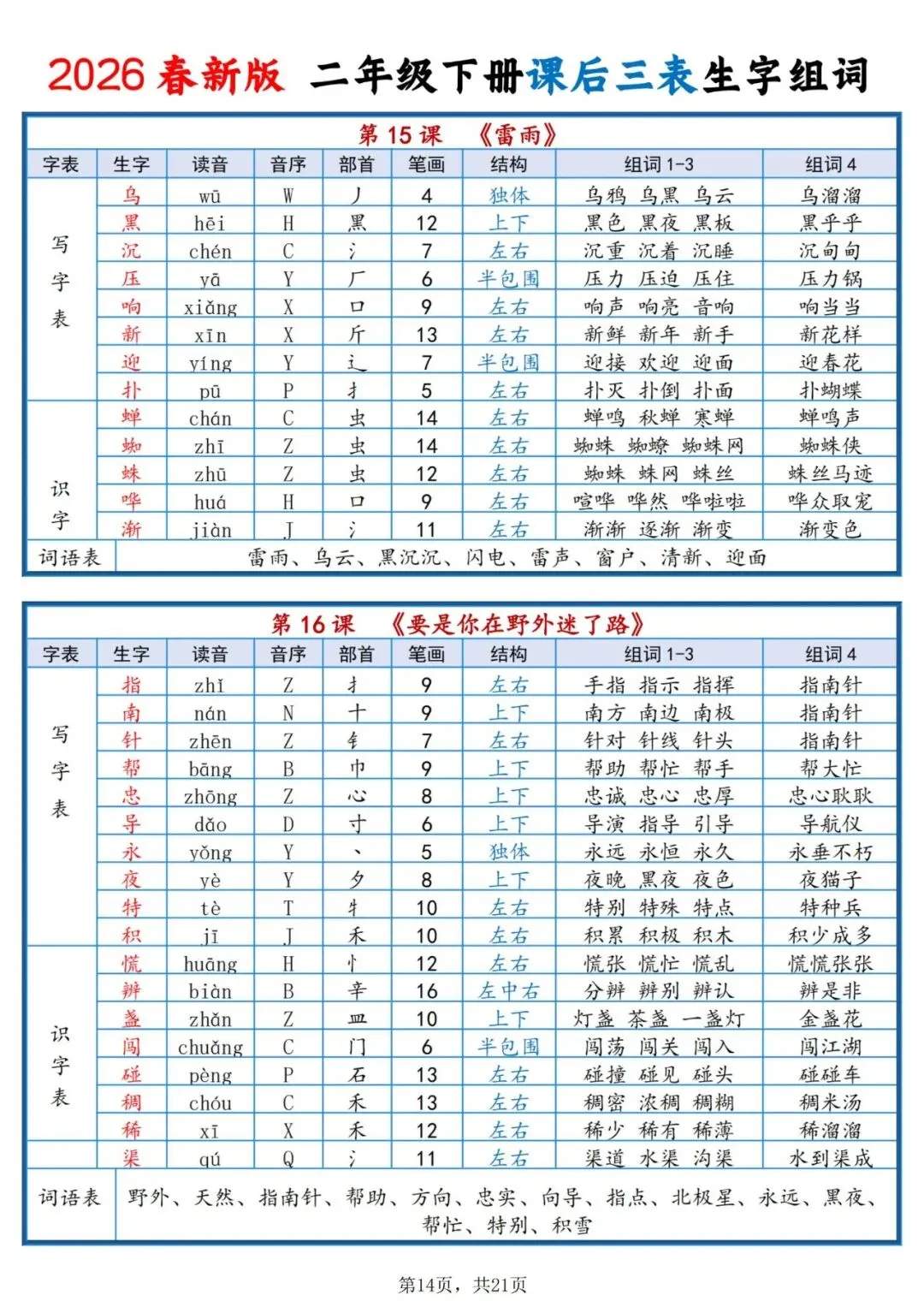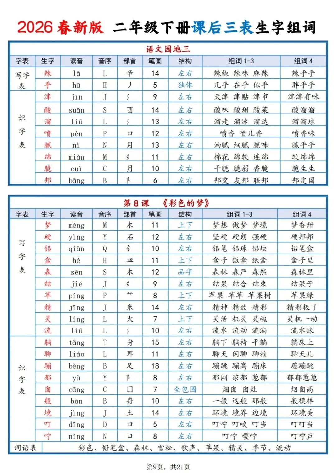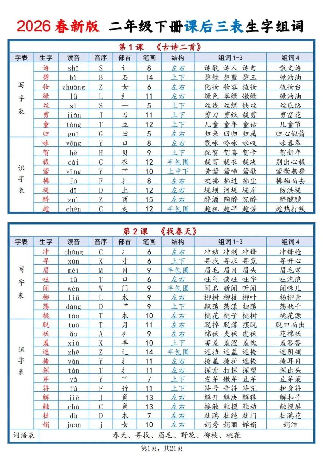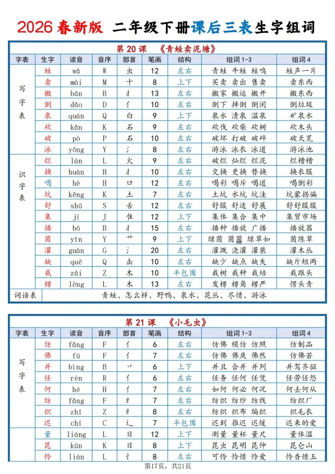 高清电子版!26春二年级下册语文课后三表生字组词,可打印21页