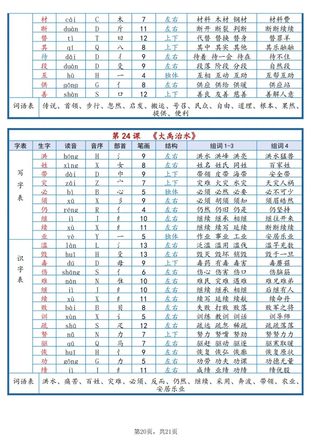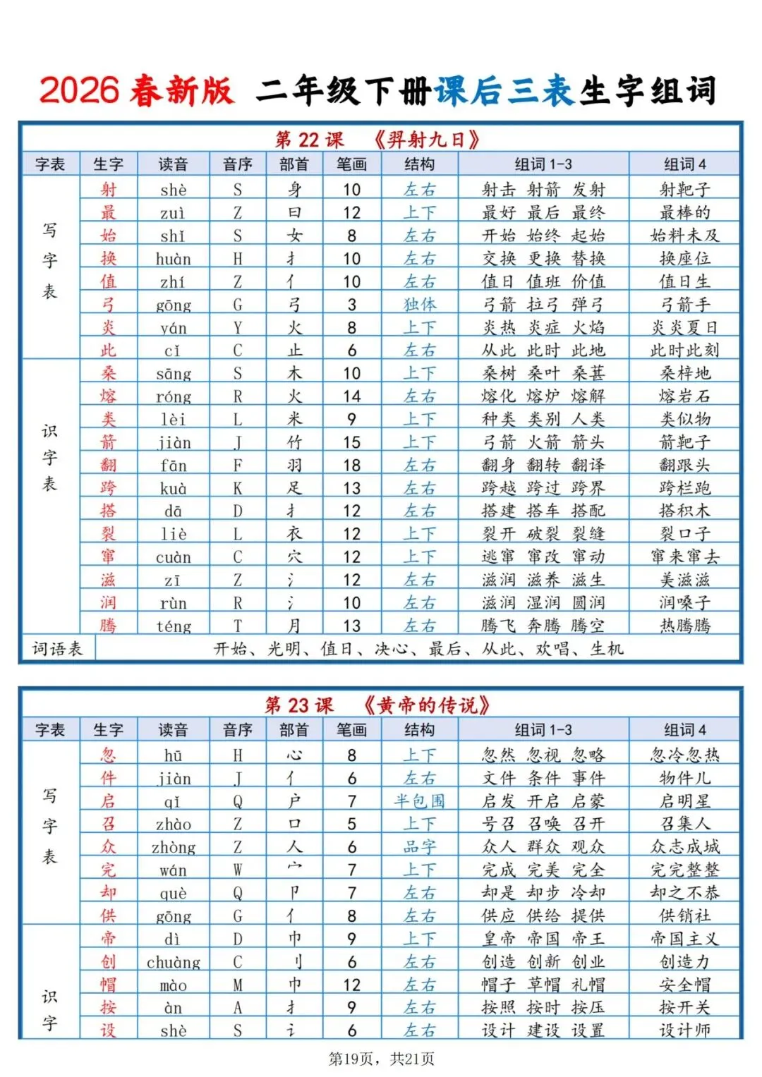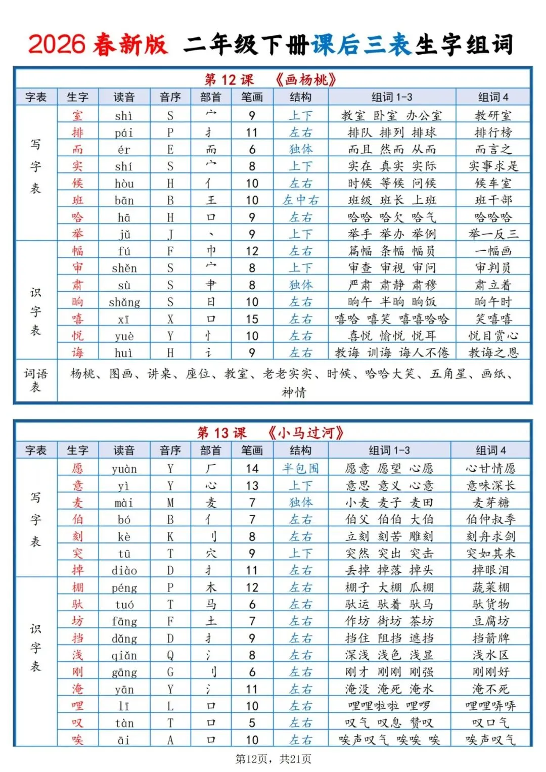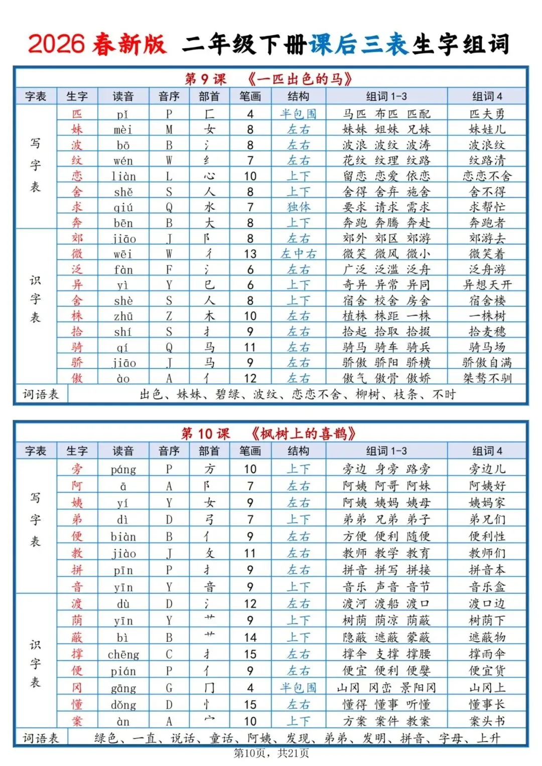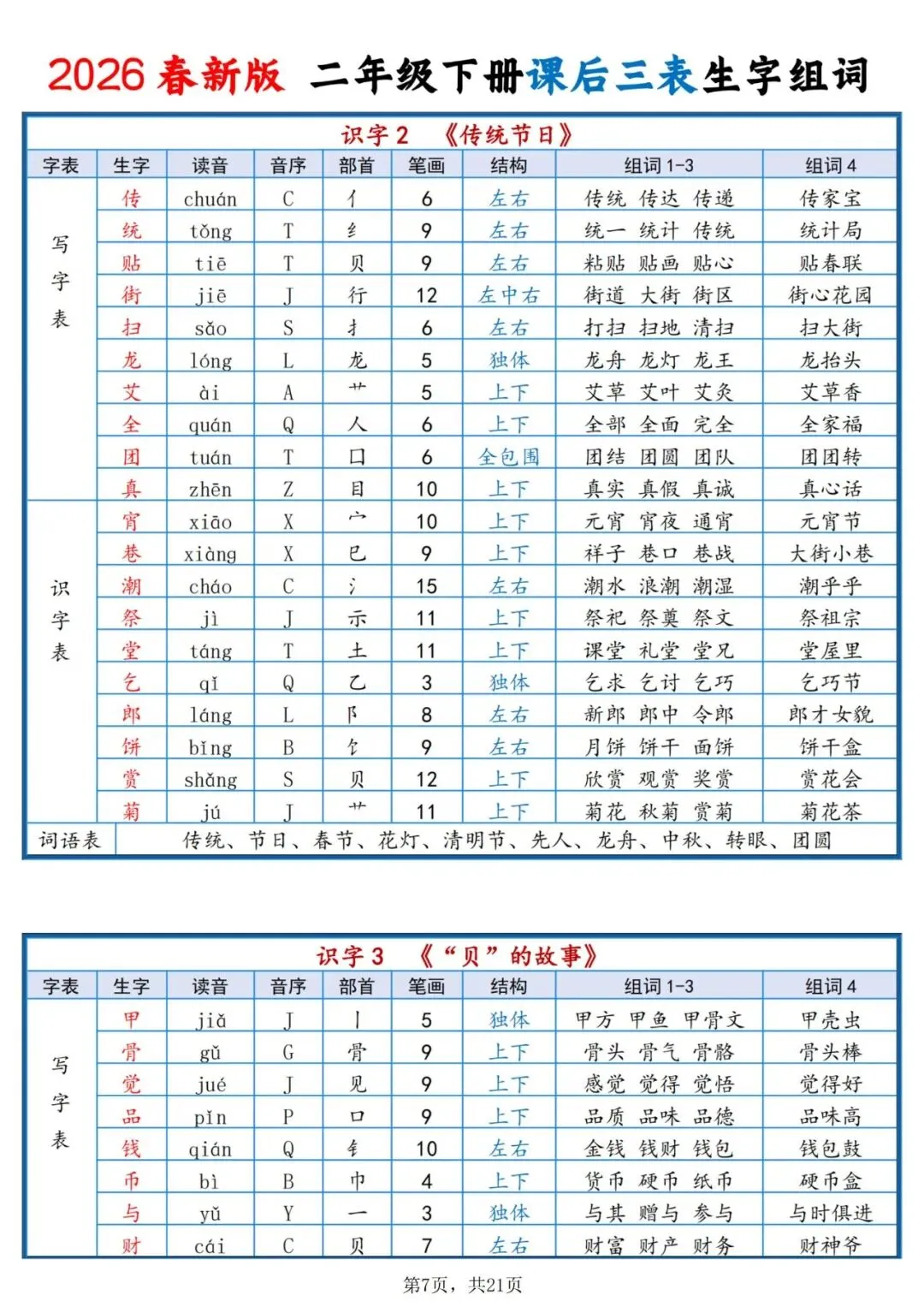 高清电子版!26春二年级下册语文课后三表生字组词,可打印21页