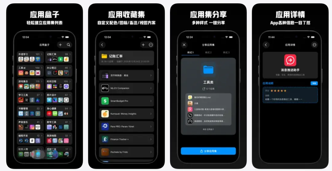 应用盒子 收藏应用 应用集管理,可以把我们喜欢的应用添加进去,分类成不同的文件夹进行归纳、也可以分享给我们的朋友。