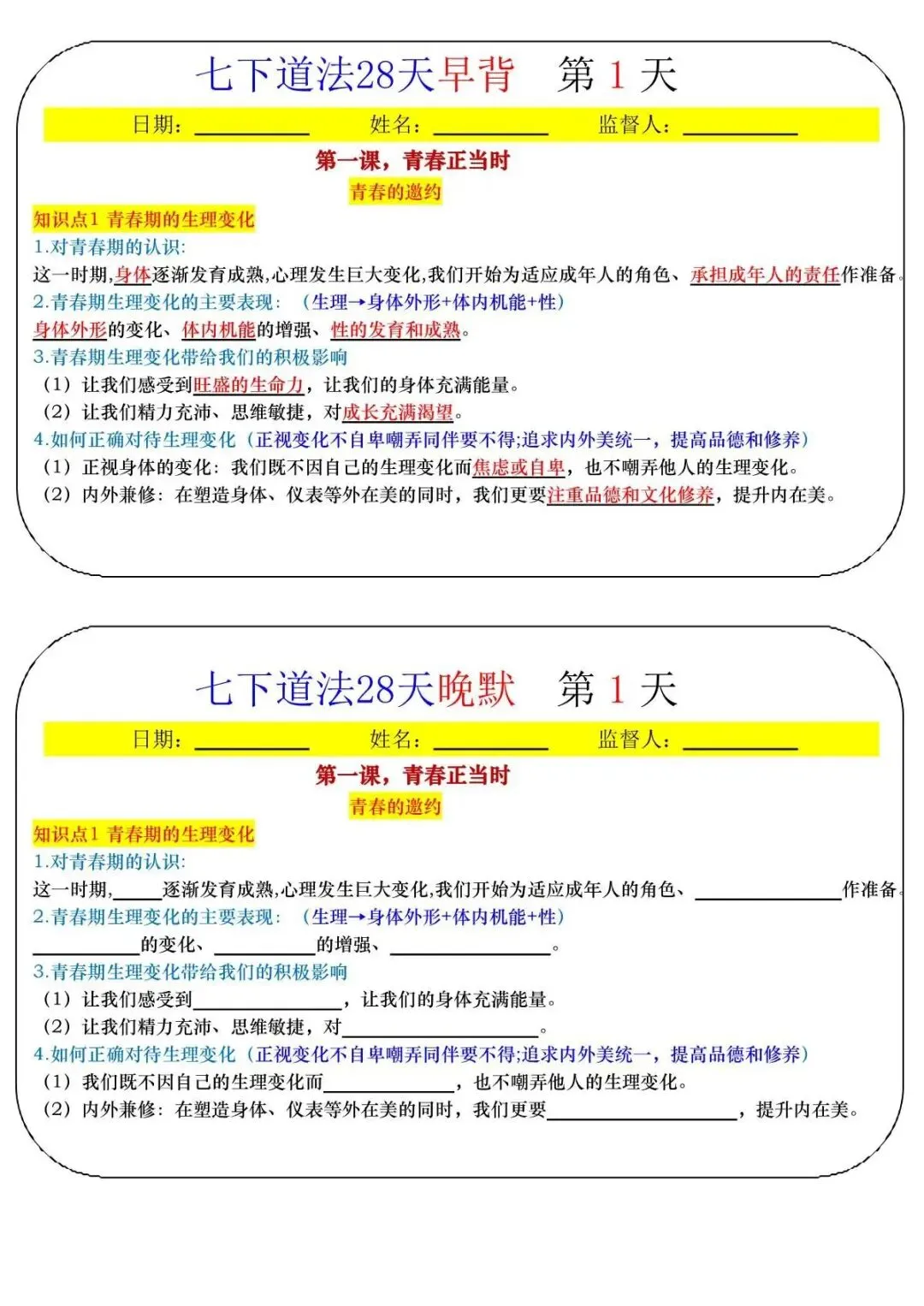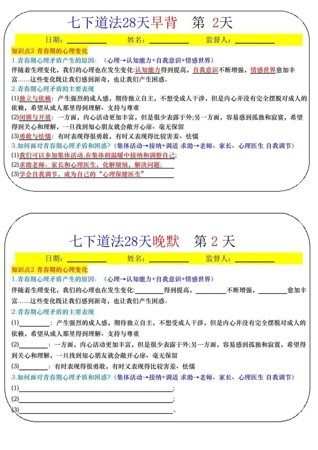 七下道法寒假预习28天早背晚默(pdf可下载)