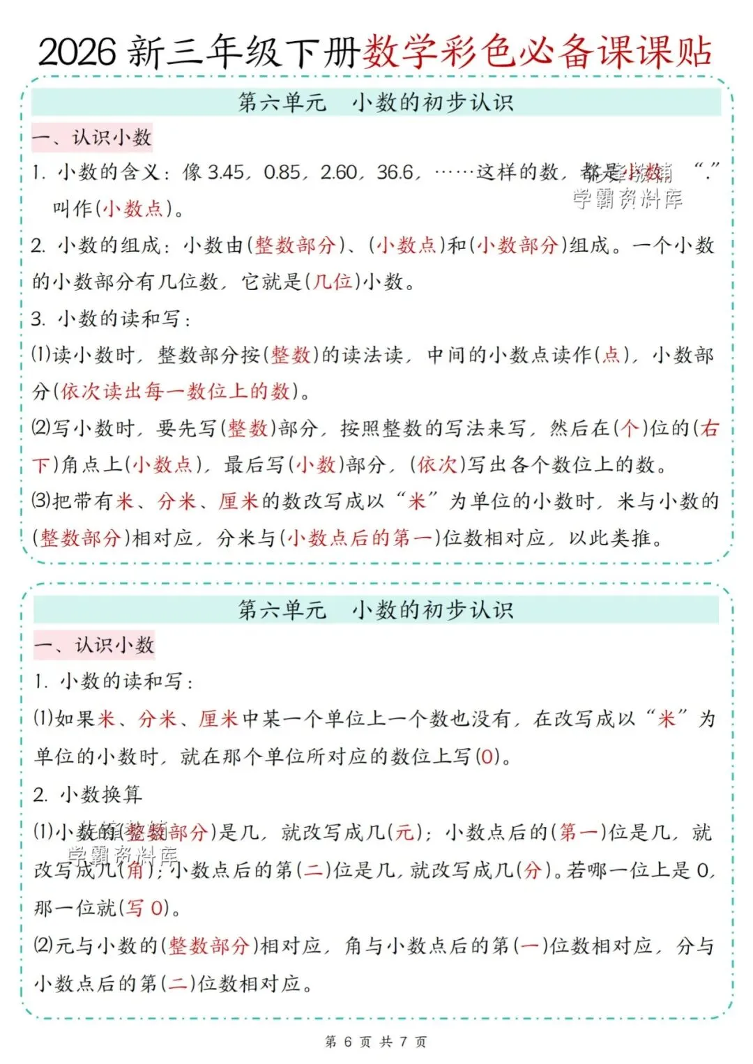 《26春三年级(下)数学彩色必备课课贴》可免费下载打印