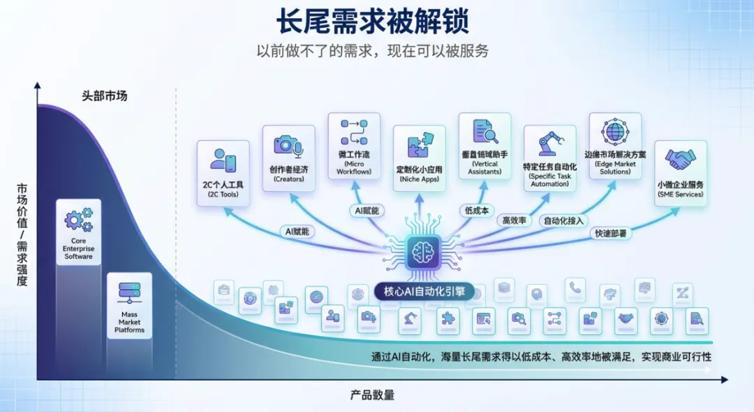 现在 AI 降低了研发、内容、客服、运维成本,很多长尾需求第一次具备了商业可行性。