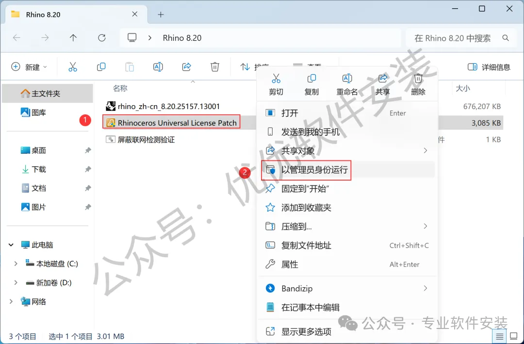 10、回到Rhino 8.20文件夹,找到【Rhinoceros…Patch】程序,右键选择【以管理员身份运行】它