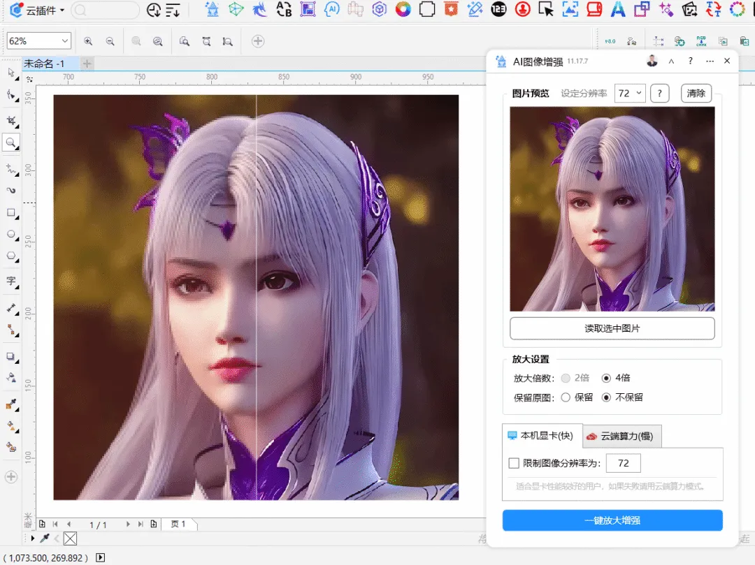 功能简介:基于人工智能算法,可将低像素的图像放大变清晰,转换为高清的图像,非常适用于小的卡通图片、卡通插图的放大,可以使印刷成品更加清晰美观。