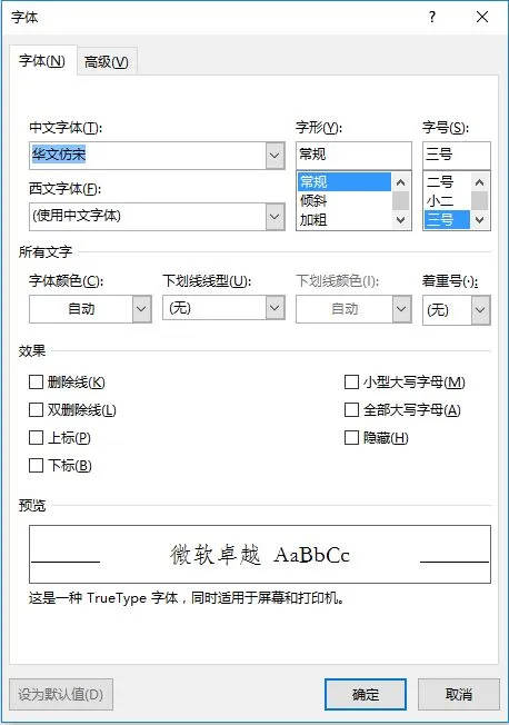 3.切换到“文档风格”选项卡,点击”字体设置“按钮。在打开的对话框中将“字号”设置为“三号”(这是关键设置点2,必须设置),中文字体设置为“仿宋”,西文字体设置为“使用中文字体”,单击“确定”按钮。