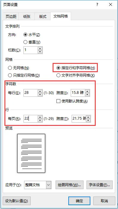 4.在“网格”栏中选中“指定行和字符网格”单选按钮,激活“字符数”和“行数”栏。分别在“字符数”栏和“行”栏中设置每行为“28”,每页为“22”。