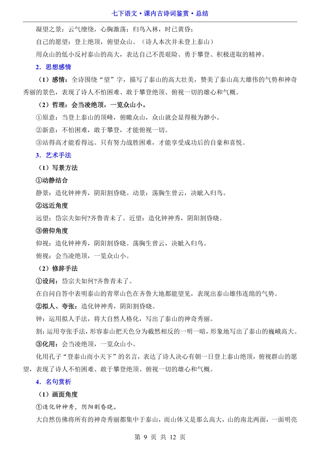 七下语文课内古诗词鉴赏总结(完整版)可打印!