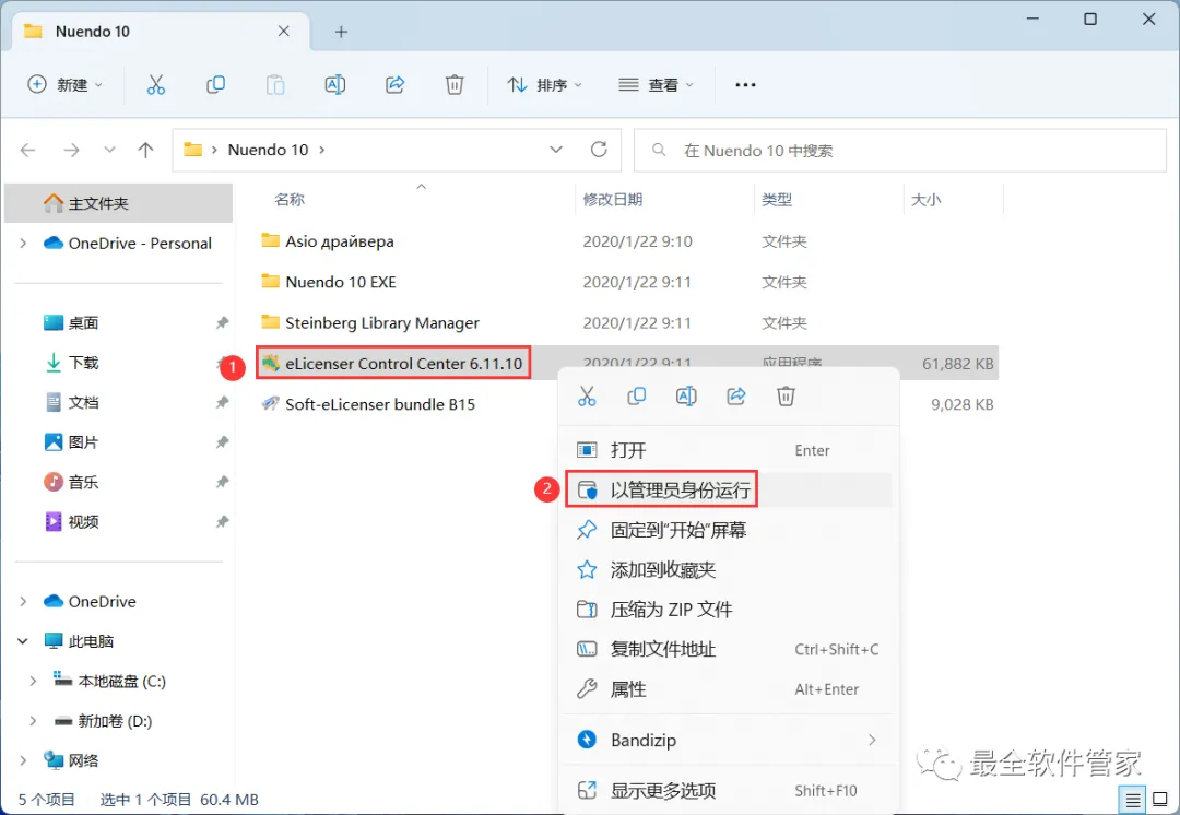9、回到Nuendo 10文件夹,找到【Soft- eLicenser bundle B15】应用程序,右键选择【以管理员身份运行】它