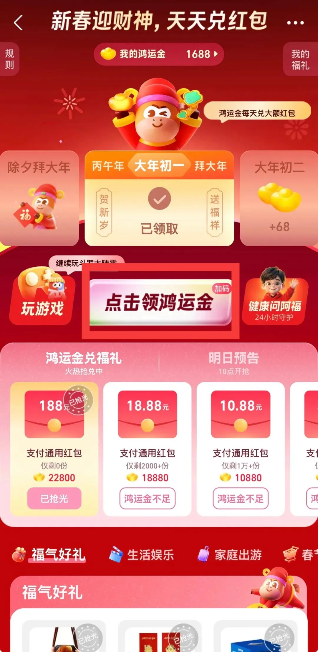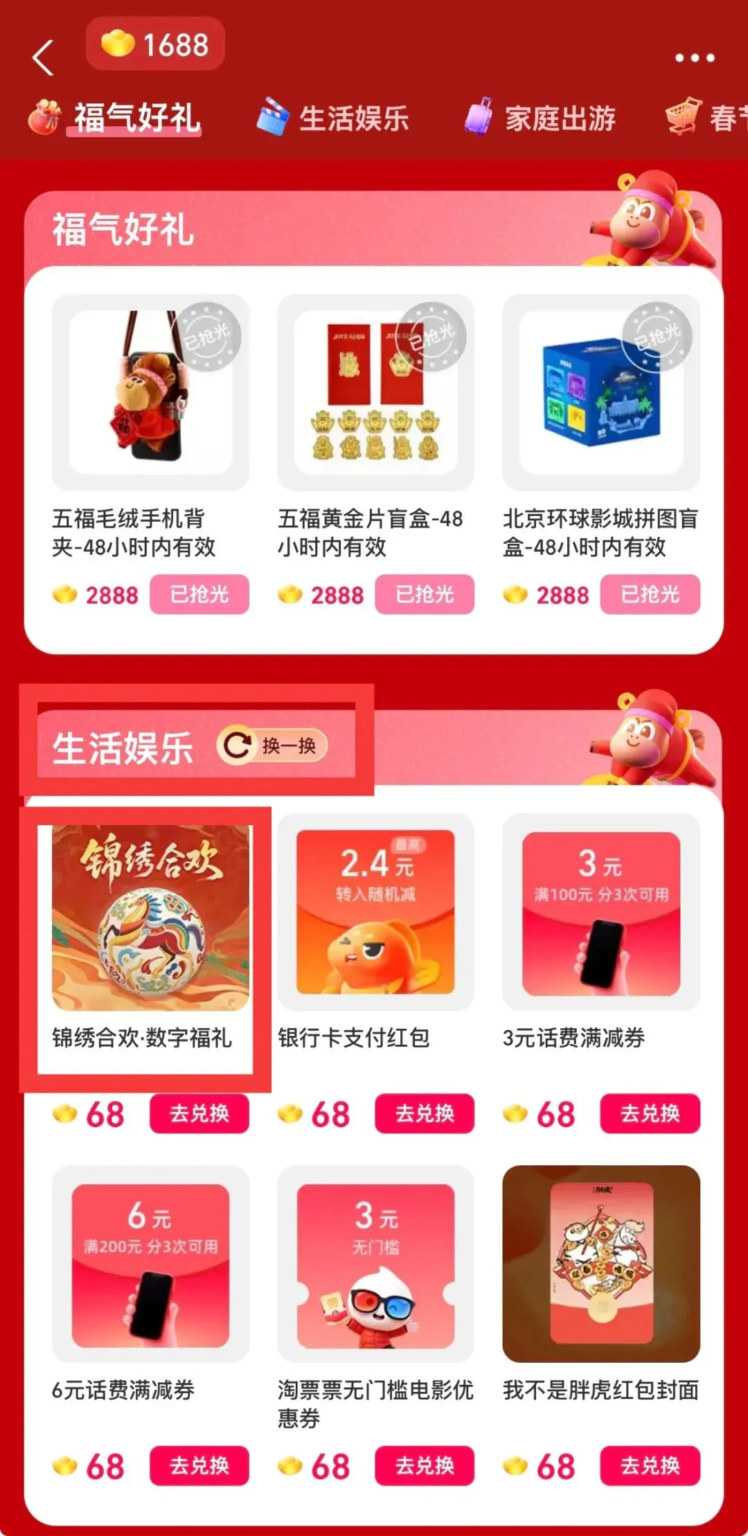 2、进入过后找到“生活娱乐”点击换一换在里面找到“锦绣合欢·数字福礼”点击去兑换68鸿运金就能兑换《锦绣合欢》数字藏品了