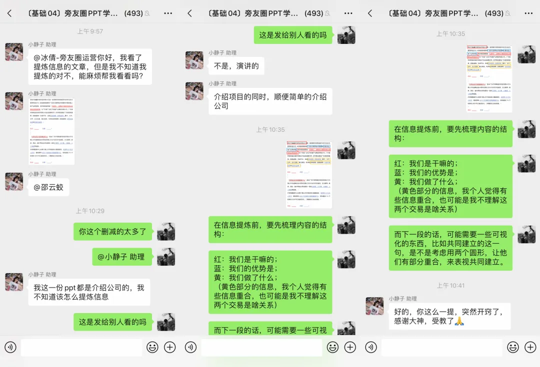 前两天,有一位学员,问我该如何对 PPT 页面上的信息,进行提炼,并且呢,发给了我,她提炼的一些结果: