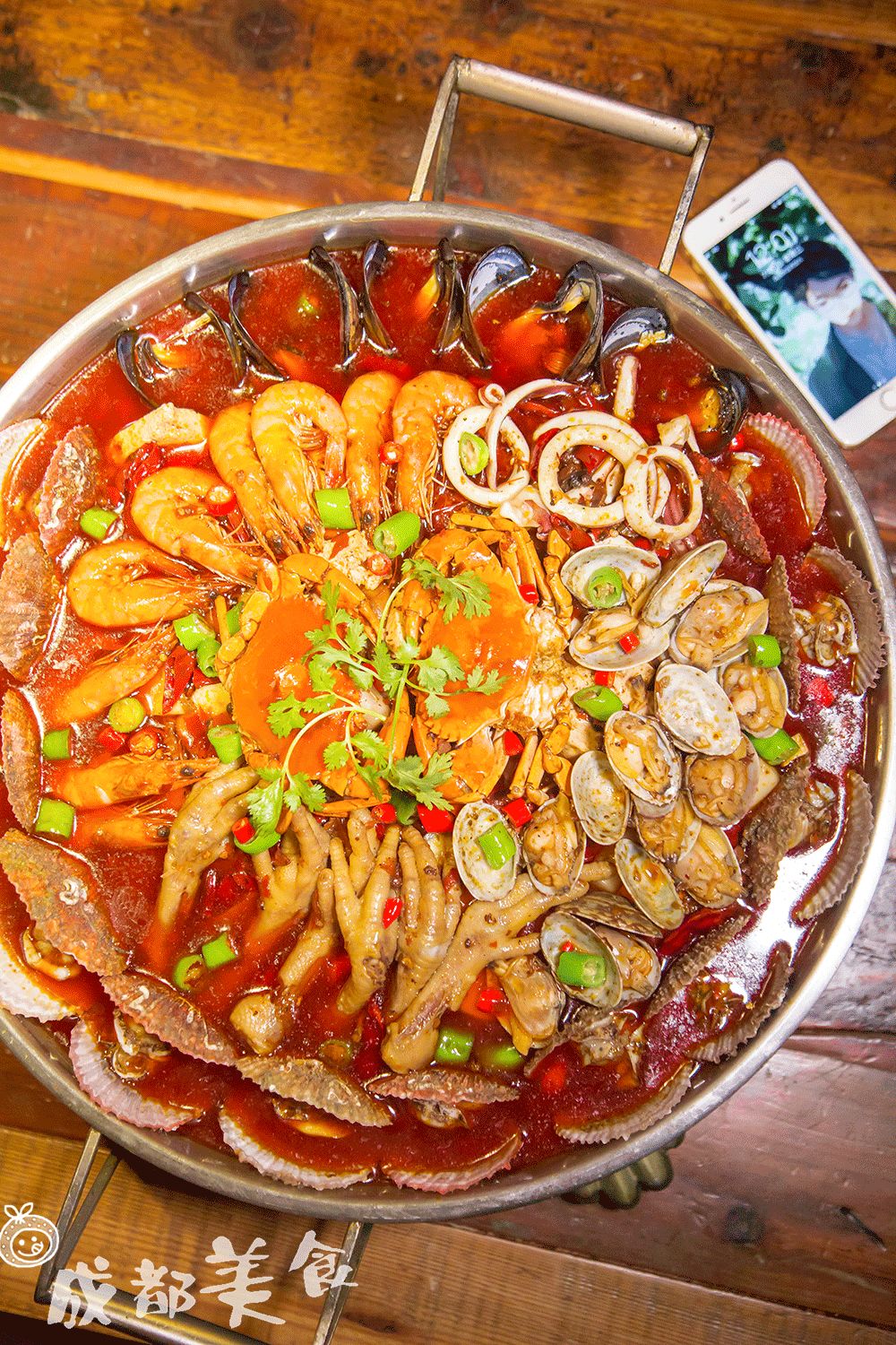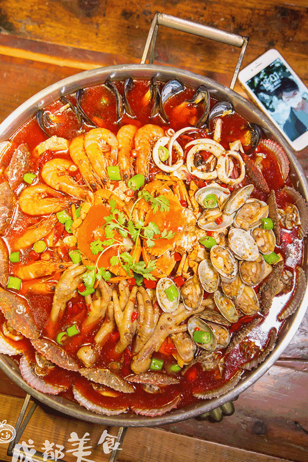 除了川式香辣蟹是必点以外,现在也有了网红霸王海鲜锅,价值188元,分量很大可以与旁边的苹果7对比一下。