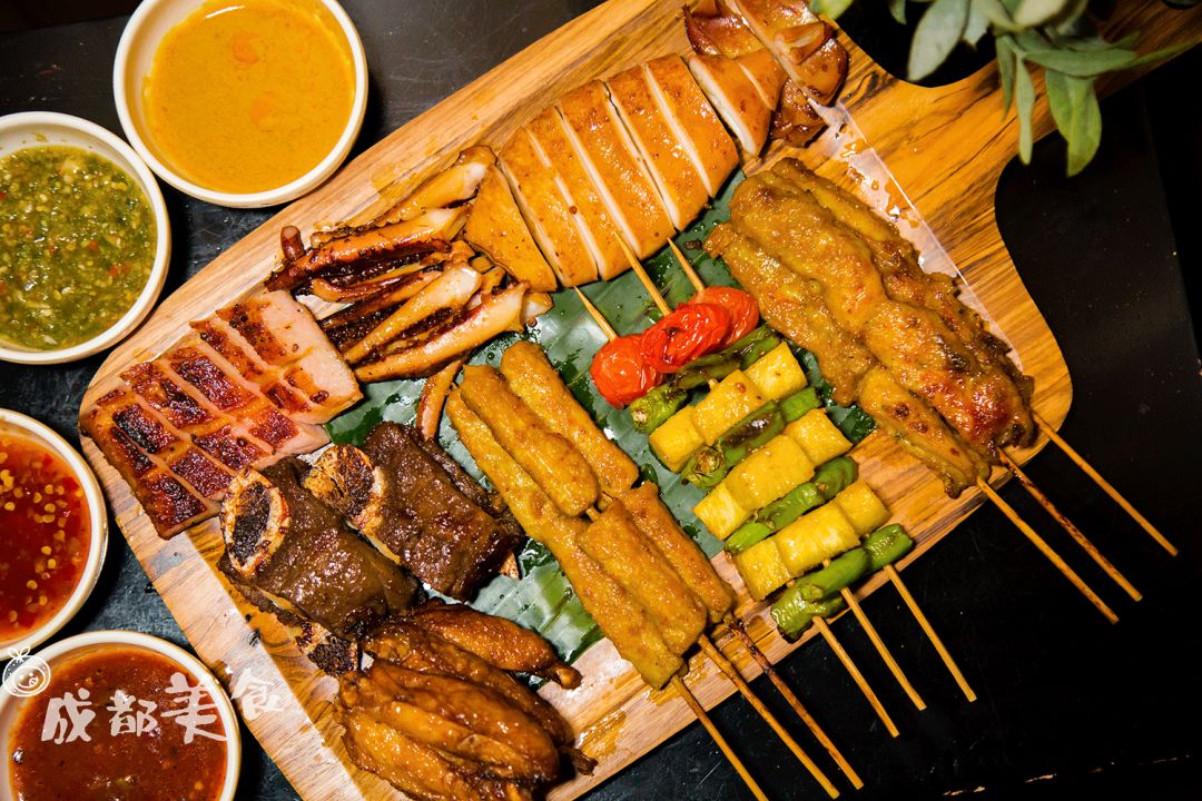 想感受泰国的街边炭烧,点一个拼盘就够了,肉串、水果串、鱿鱼、猪颈肉、牛仔骨、鸡翅,搭配4种特色酱料,就是一个小泰国碳烤集市。