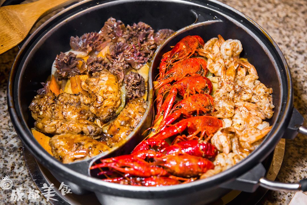 焖锅里面的菜品都是可以随意组合,耙和的鸡中翅,富有嚼劲的鸡胗,看着就垂涎欲滴的小龙虾等等,最下面铺的则是由胡萝卜西芹大枣等新鲜蔬菜。
