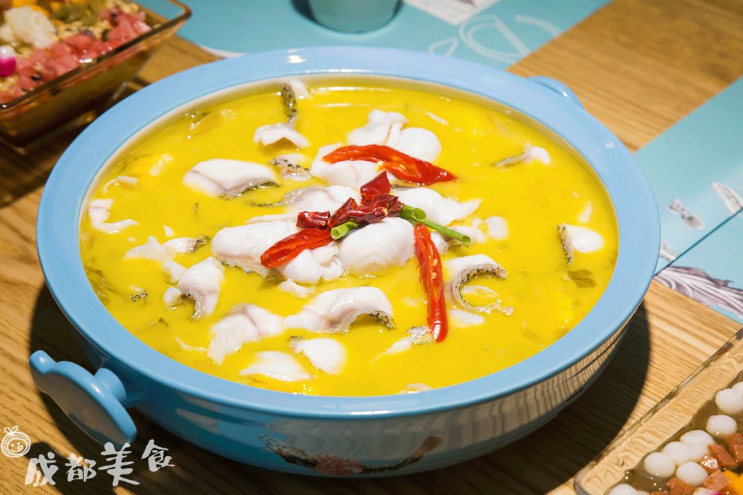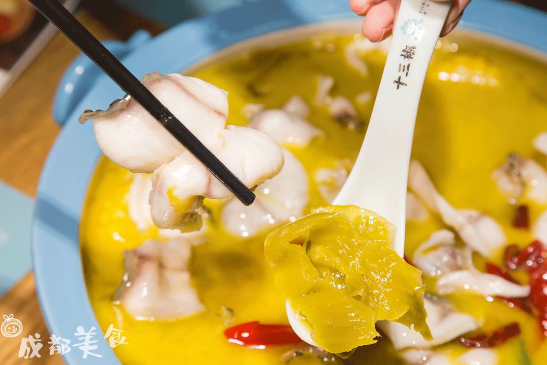 招牌老坛酸菜鱼的底汤是大骨和土鸡熬制的,酸菜则是乳酸菌发酵加了13种香料秘制。鱼片微微打卷肉质细嫩与酸菜一起吃口感更佳丰富。