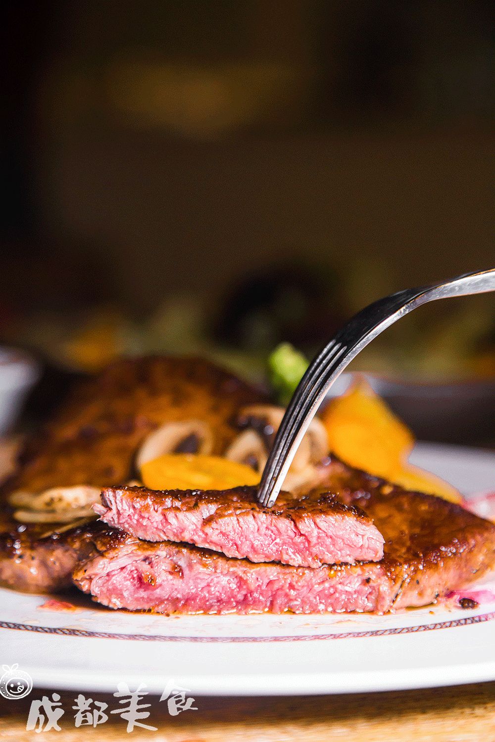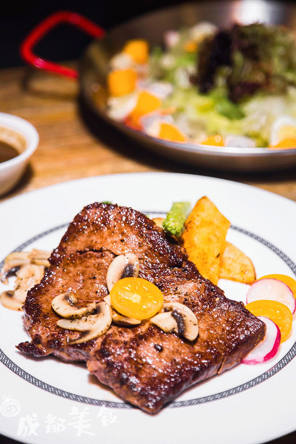 菲力牛排,煎炙的三分熟,外面看上去和熟牛排区别不大,中间部分仍然保留原生态,口感很细腻嫩滑。