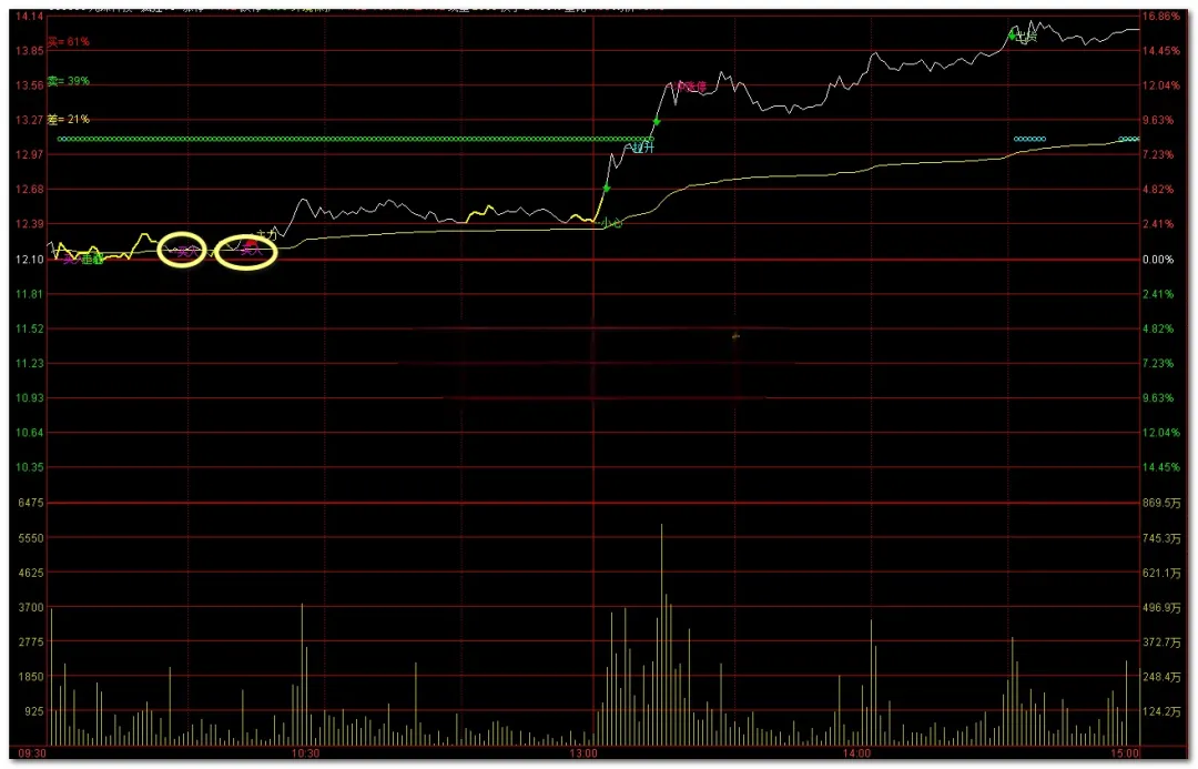 条件 :左上角的**“差”值大于10%(说明买盘碾压卖盘),且 “比”**值大于2。信号 :分时图中出现**“–拉升”、 “–冲涨停”字样,或者出现红色 “突”**字图标。操作 :这通常意味着主力资金达成一致,准备冲板。只要此时股价在**均价线(黄色线)**上方,可激进跟进。