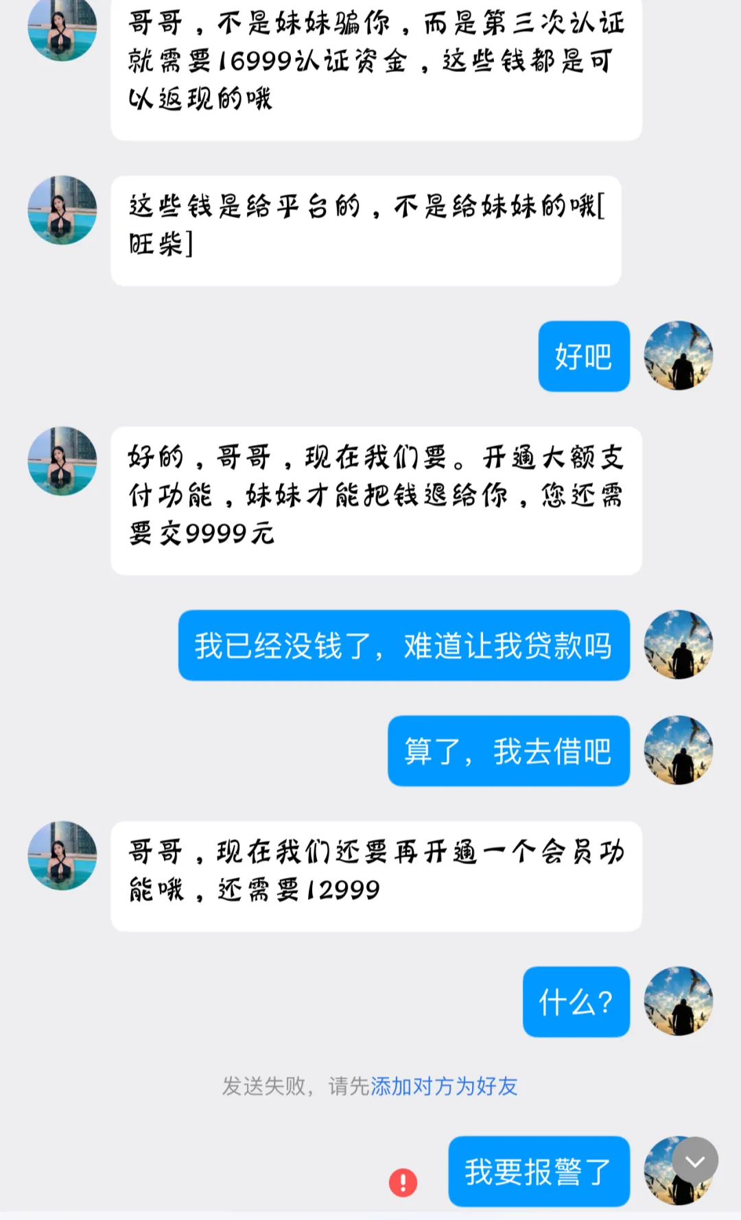 当受害人完成了一笔大额充值任务后。“客服”就会以协议规定、开通权限、受害人操作失误等理由,要求受害人进行多次转账,直至受害人察觉被骗。