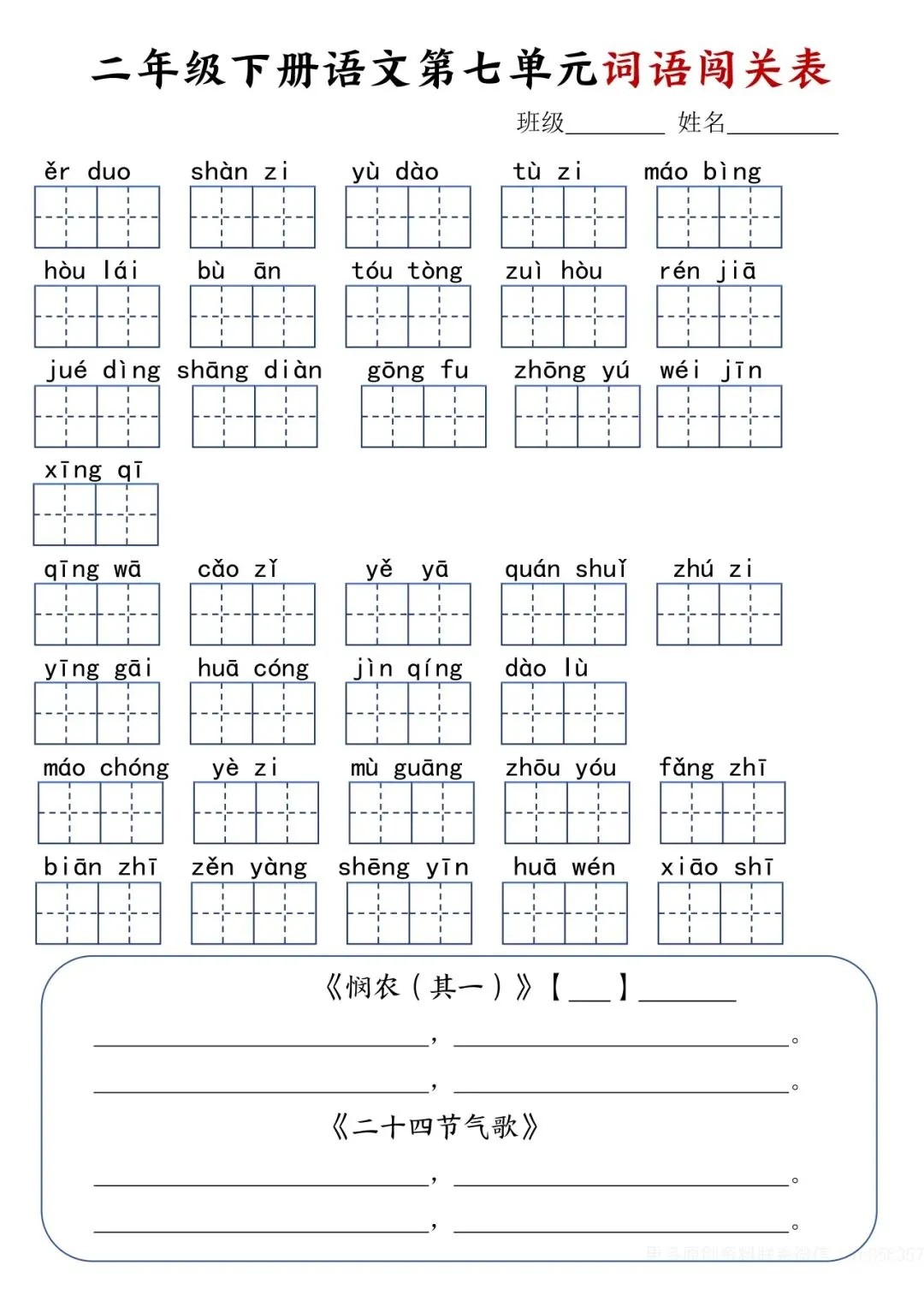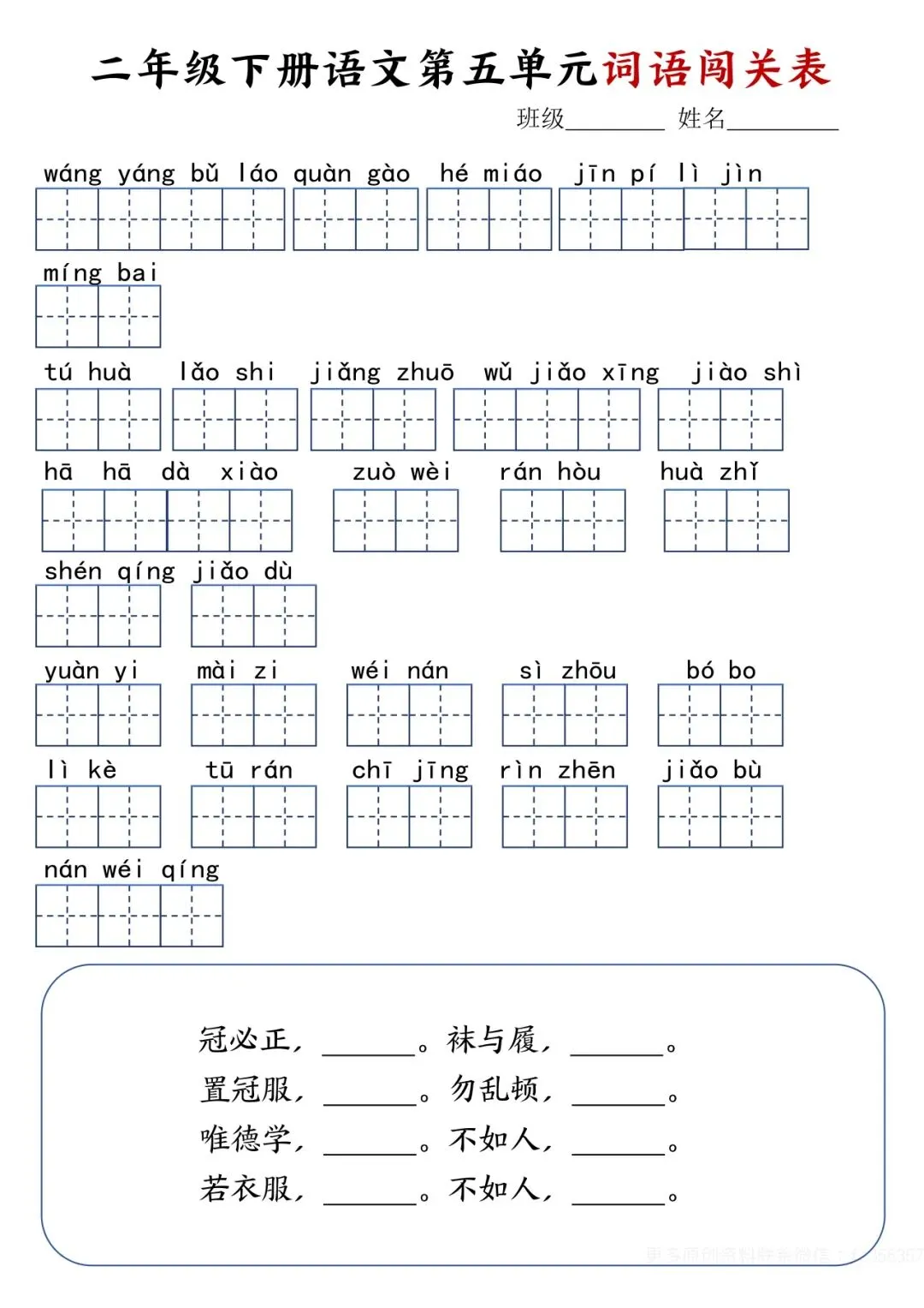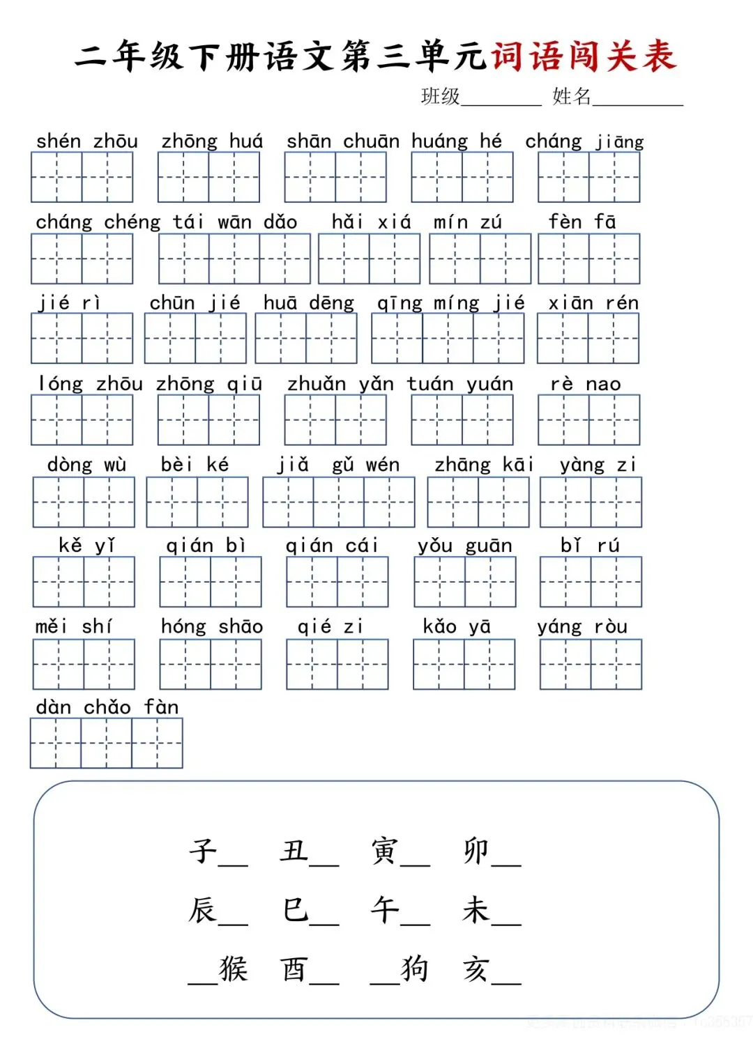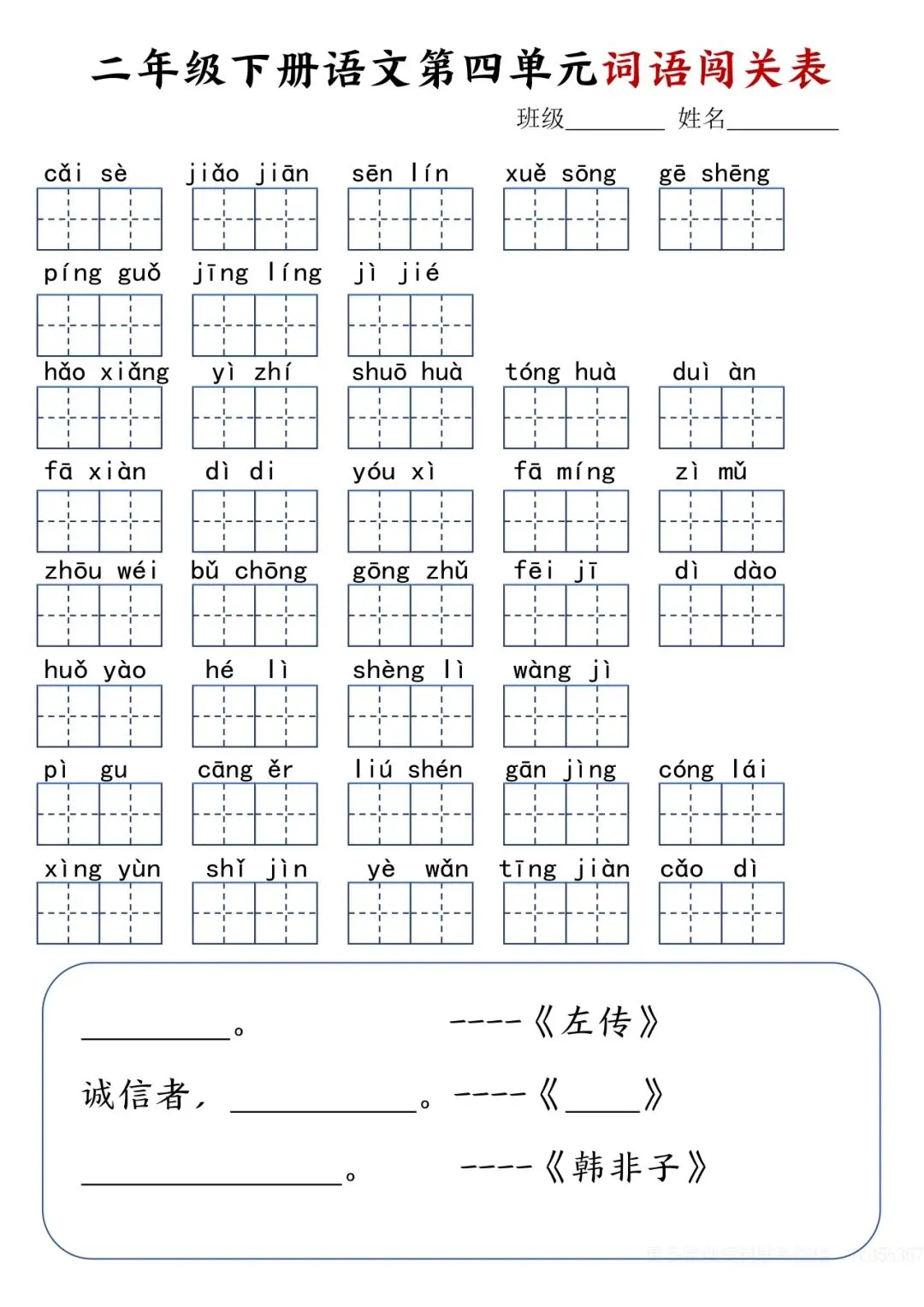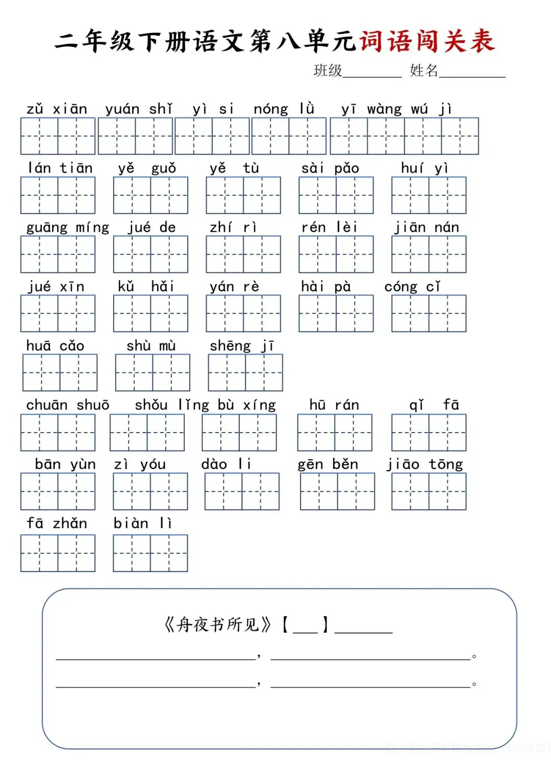 26年春《二年级下册语文单元词语闯关表》电子版可打印