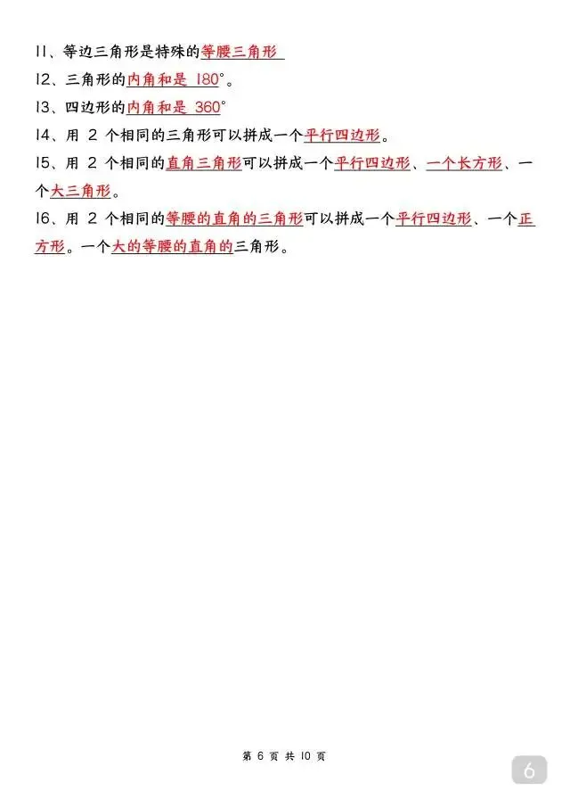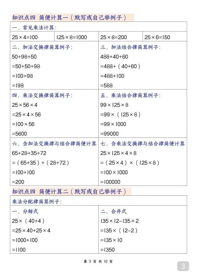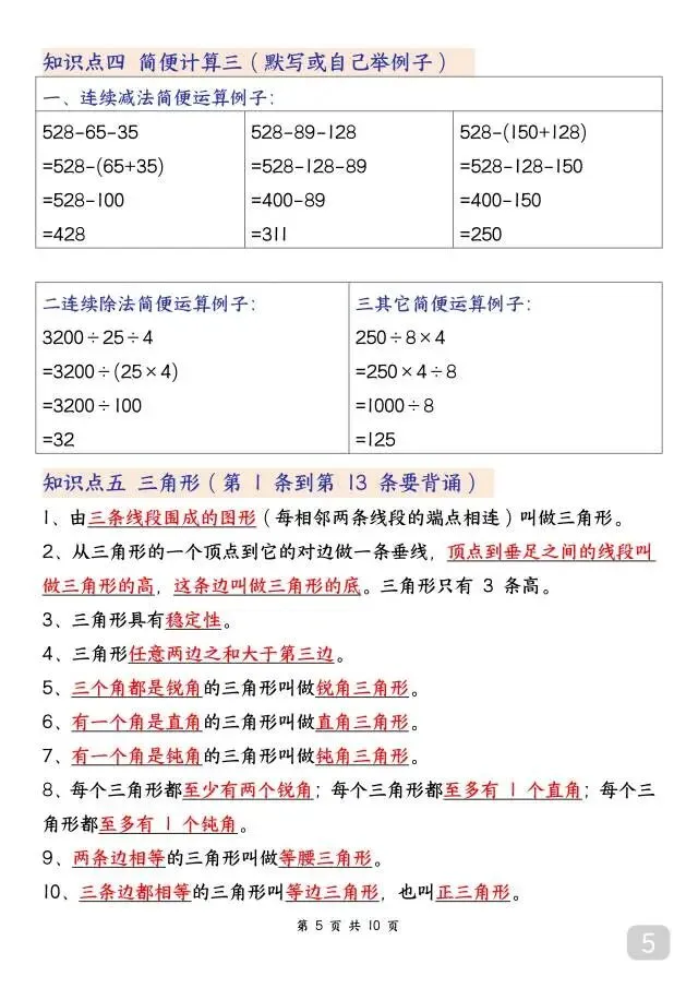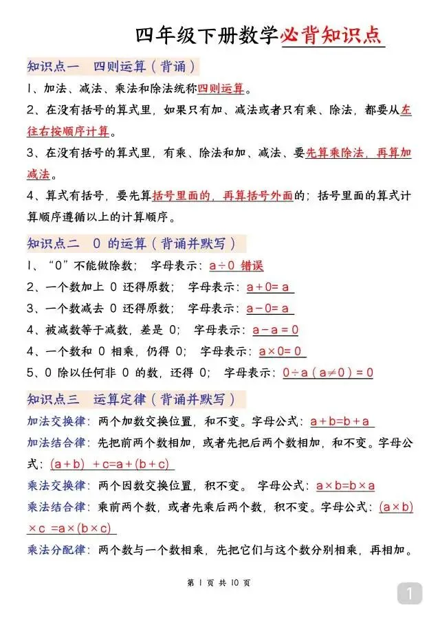 这份人教版四年级下册数学必背知识点超实用!10页内容全覆盖四则运算、运算定律、三角形、小数的意义和性质等全册核心考点,重点知识标注背诵/默写要求,搭配公式、例题和解题方法,条理清晰、重点突出。不管是日常背诵记牢知识点,还是考前快速梳理考点,都特别适用,是四年级孩子夯实数学基础、提升运算和解题能力的优质资料~