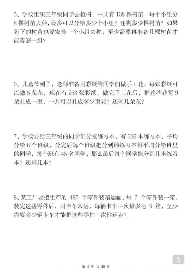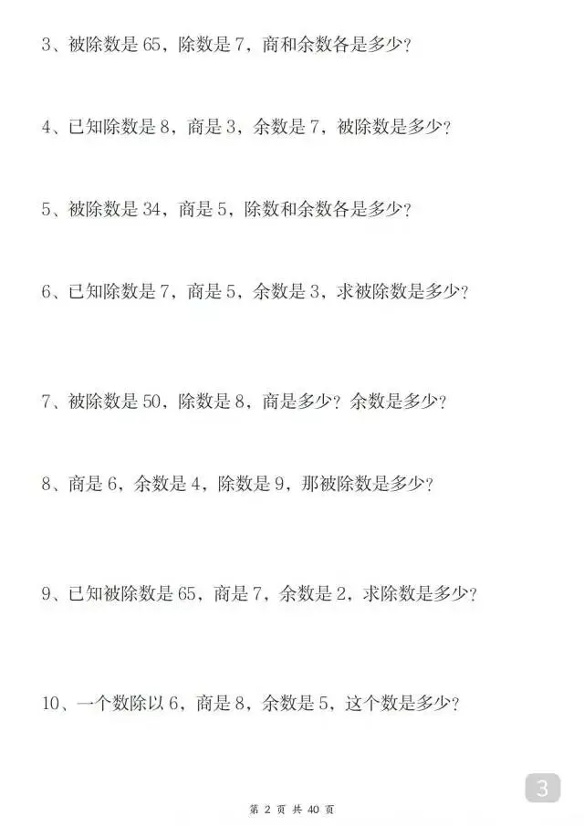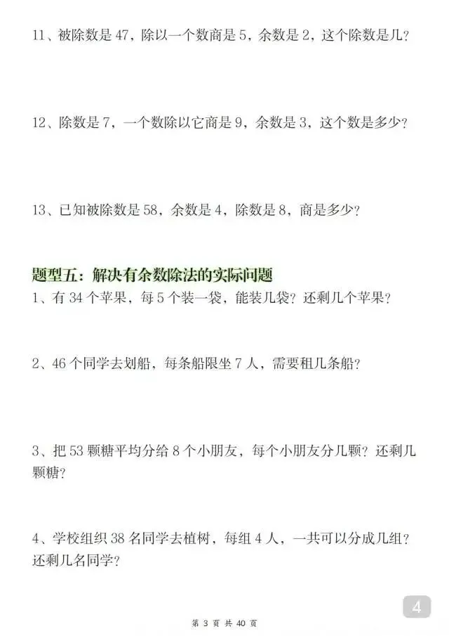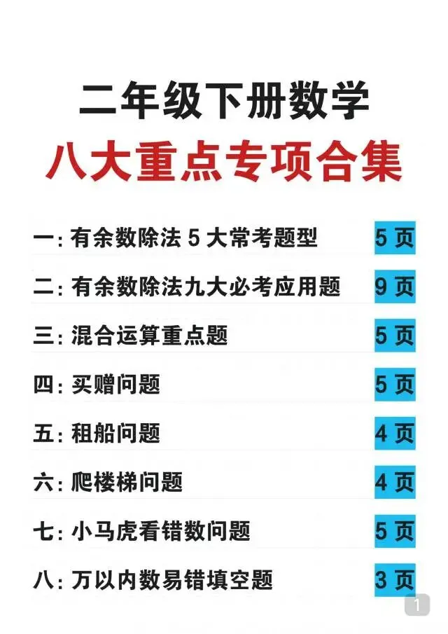 这份人教版二年级下册数学八大重点专项合集超实用!54页内容聚焦有余数除法、混合运算、买赠/租船/爬楼梯等高频重难点,每个专项分题型讲方法、配海量练习题,还附完整答案,精准攻克易错点和应用题难点。题型贴合课堂考点,解题思路清晰易懂,是孩子同步练习、查漏补缺、夯实数学基础的优质资料,帮孩子轻松搞定二年级下册数学核心考点~家长抓紧打印出来给孩子练一练吧!