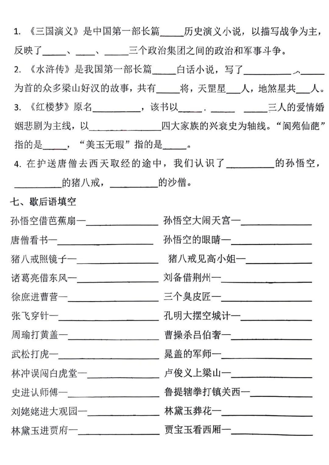 【免费下载】五年级(下)语文四大名著知识点填空
