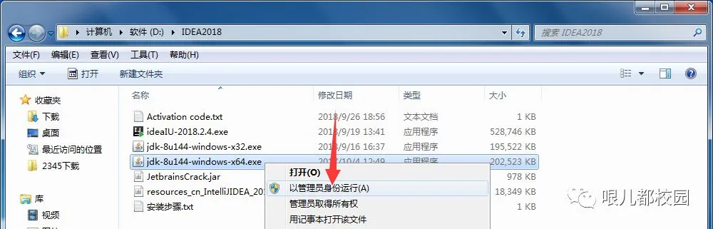 2.查看电脑系统类型,打开“IDEA2018”文件夹,64 位操作系统,鼠标右击“jdk-8u144-windows-x64”,选择“以管理员身份运行”(32 位操作系统,鼠标右击“jdk-8u144-windows-x32”,选择“以管理员身份运行”)