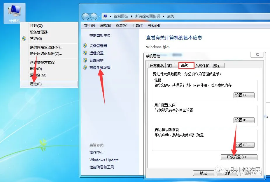 9.鼠标右击“计算机”—点击“属性”—点击“高级系统设置”—选择“高级”选项卡—点击“环境变量”