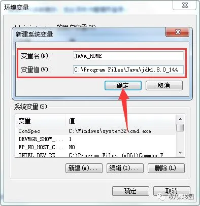 11.新建系统变量,输入变量名“JAVA_HOME”,变量值“C:\Program Files\Java\jdk1.8.0_144”,然后点击“确定”(温馨提示:如果安装的是32位的Java,变量值则输入“C:\Program Files (x86)\Java\jdk1.8.0_144”)