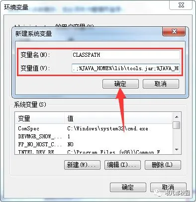 13.再次新建系统变量,输入变量名“CLASSPATH”,变量值“.;%JAVA_HOME%\lib\tools.jar;%JAVA_HOME%\lib\dt.jar”,然后点击“确定”