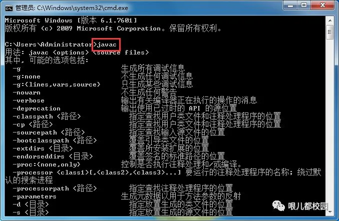 21.输入“javac”,然后敲击“回车”键,如果出现以下信息,就说明Path配置成功
