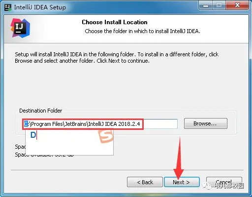 24.选择安装目录,默认安装在 C:\Program Files\JetBrains\IntelliJ IDEA 2018.2.4(建议安装在除C盘以外的磁盘上,可以直接将C改成D,安装到D盘),然后点击“Next”