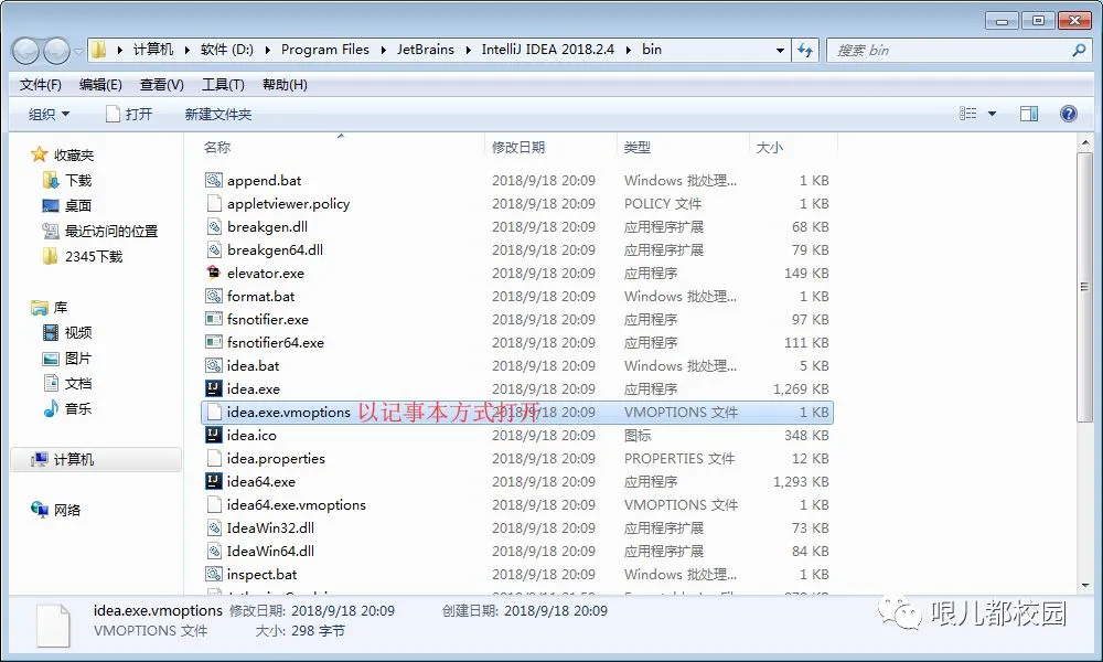 32.同样在安装路径 X:\Program Files\JetBrains\IntelliJ IDEA 2018.2.4 下的“bin”文件夹中(其中“X”是你安装软件的磁盘号),找到“idea64.exe.vmoptions”文件,选择以记事本方式打开