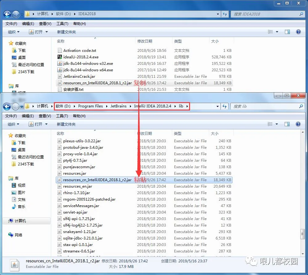 34.打开“IDEA2018”文件夹,将文件“resources_cn_IntelliJIDEA_2018.1_r2.jar”复制粘贴到安装路径 X:\Program Files\JetBrains\IntelliJ IDEA 2018.2.4 下的“lib”文件夹中(其中“X”是你安装软件的磁盘号),如下图所示