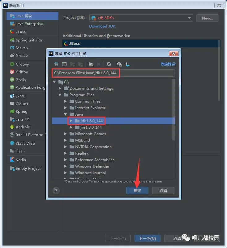 46.选择 JDK 的主目录“C:\Program Files\Java\jdk1.8.0_144”,然后点击“确定”