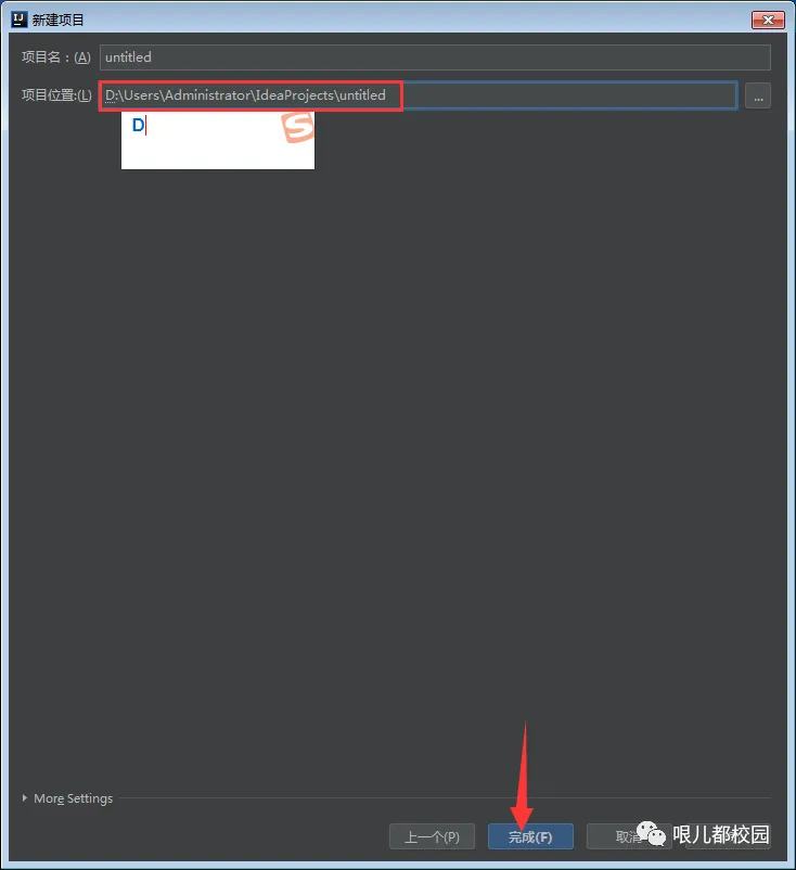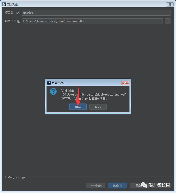 49.新建项目,选择项目位置,默认保存到 C:\Users\Administrator\IdeaProjects\untitled(建议保存到除C盘以外的磁盘上,可以直接将C改成D,保存到D盘),然后点击“完成”