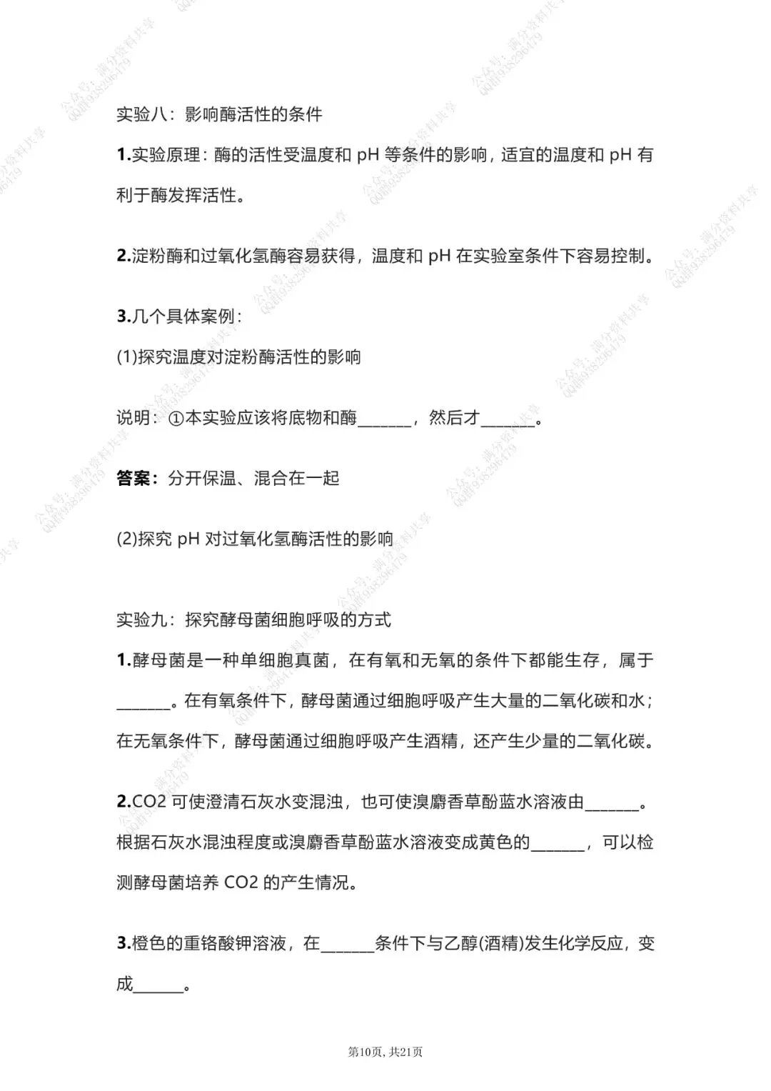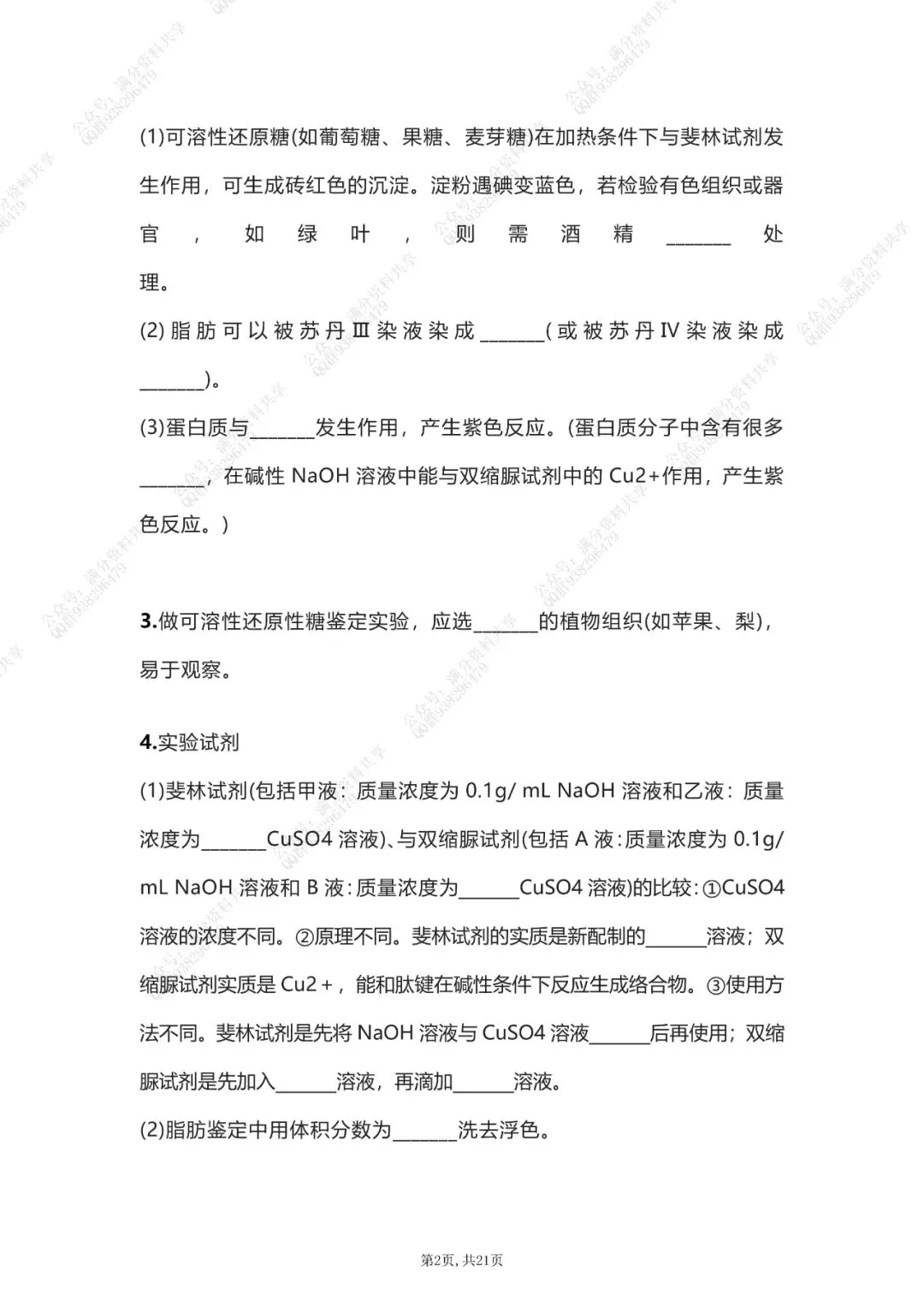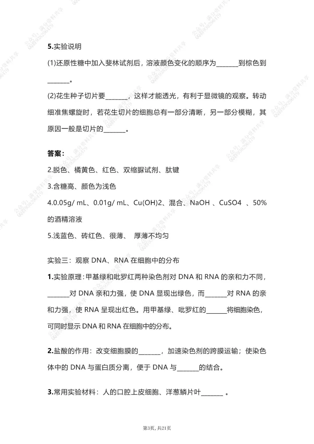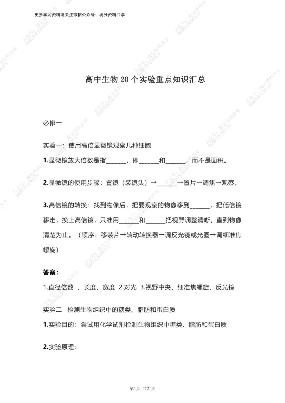 高中生物20个实验重点知识汇总(pdf分享) 点击图片可观看高清版,文末有获取打印版方式 (完整版21页,部分展示) 领取完整电子版: ①:点一点右下角的“赞”和“在看”,感谢! ②:点击“关注”回复“高中资料”获取资料 点击下方“公众号”关注,可以进入主页哦!