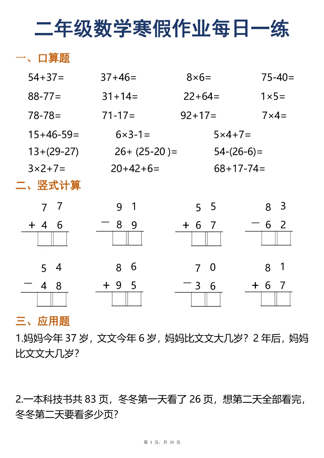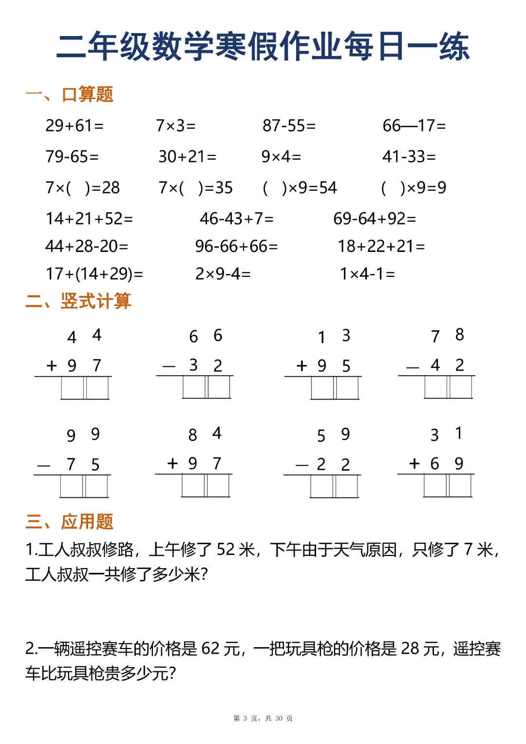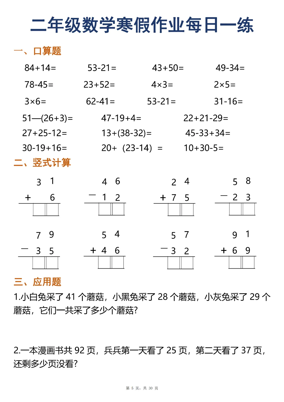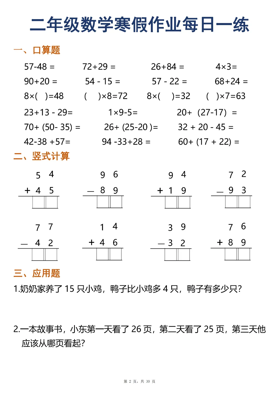 2026年《二年级数学寒假作业每日一练》电子版可打印
