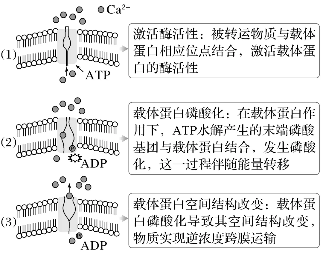 1.(2024·云南昆明模拟)当细胞膜内侧的Ca2+与其在细胞膜上的载体蛋白结合时,该载体蛋白可以催化ATP分子末端的磷酸基团转移到载体蛋白上,使载体蛋白磷酸化。磷酸化后的载体蛋白空间结构发生改变,将Ca2+释放到膜外。下列有关叙述正确的是( )