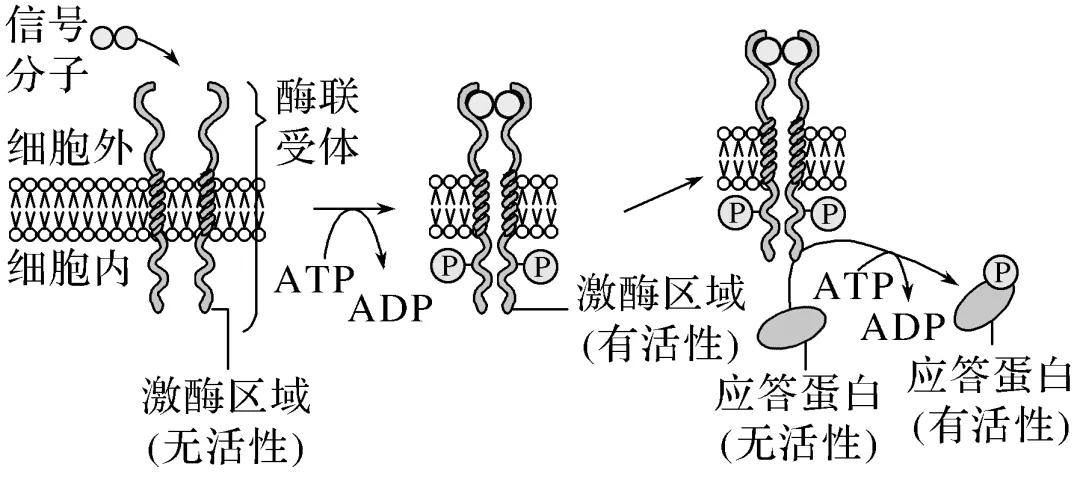 解析 由图可以直接看出,该信号分子的受体位于细胞膜上,不在细胞内,A错误;酶联受体的化学本质是蛋白质,由图可以直接看出,酶联受体识别信号分子并与其结合后,激酶区域被激活,催化相关反应,酶联受体具有识别和催化作用,但无法推出其具有运输作用,B错误;由图可知,ATP水解释放的磷酸基团(不是磷酸分子)与应答蛋白结合,使其磷酸化,应答蛋白从无活性状态转变成有活性状态,C错误;活化的应答蛋白可能通过影响基因的表达从而引起细胞定向分化,D正确。