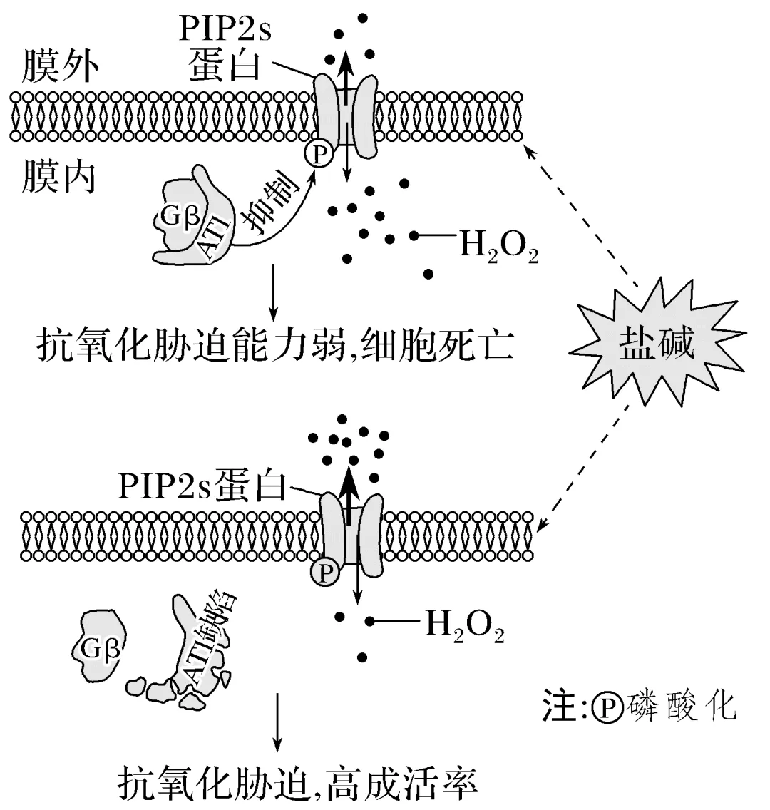 解析 根据题图分析可知,当禾本科农作物AT1蛋白与Gβ结合时,可抑制PIP2s蛋白磷酸化,从而降低H2O2的外排能力,使细胞死亡;当禾本科农作物AT1蛋白缺陷而无法与Gβ结合时,其对PIP2s蛋白磷酸化没有抑制作用(细胞膜上PIP2s蛋白磷酸化水平提高),使H2O2的外排能力提高,从而减轻H2O2对禾本科农作物细胞的毒害作用,A正确,B错误;敲除AT1基因或降低其表达,可解除AT1蛋白对细胞膜上PIP2s蛋白磷酸化的抑制作用,H2O2外排增加,进而提高禾本科农作物的抗氧化胁迫能力和成活率,C正确;可以将特殊物种中逆境胁迫相关基因转移至农作物细胞内,以改良其抗逆性,D正确。