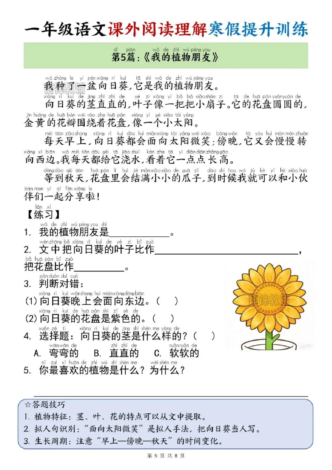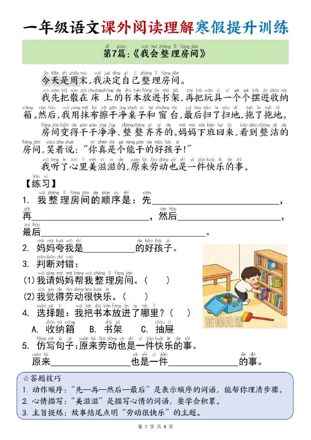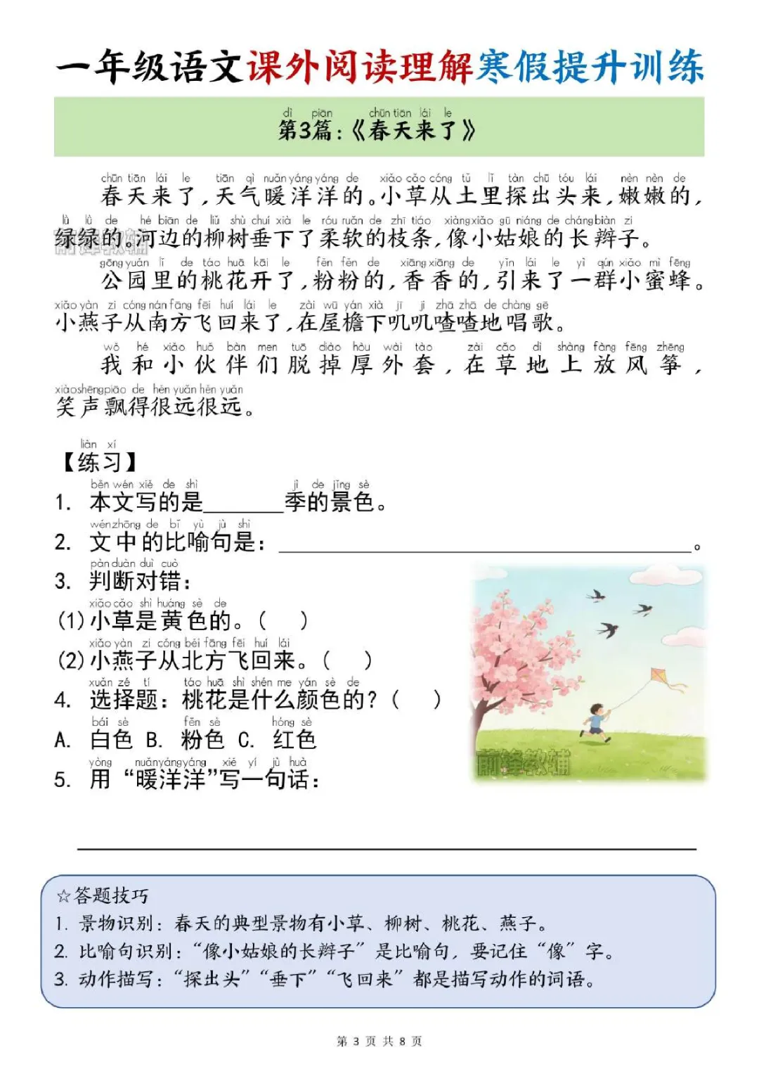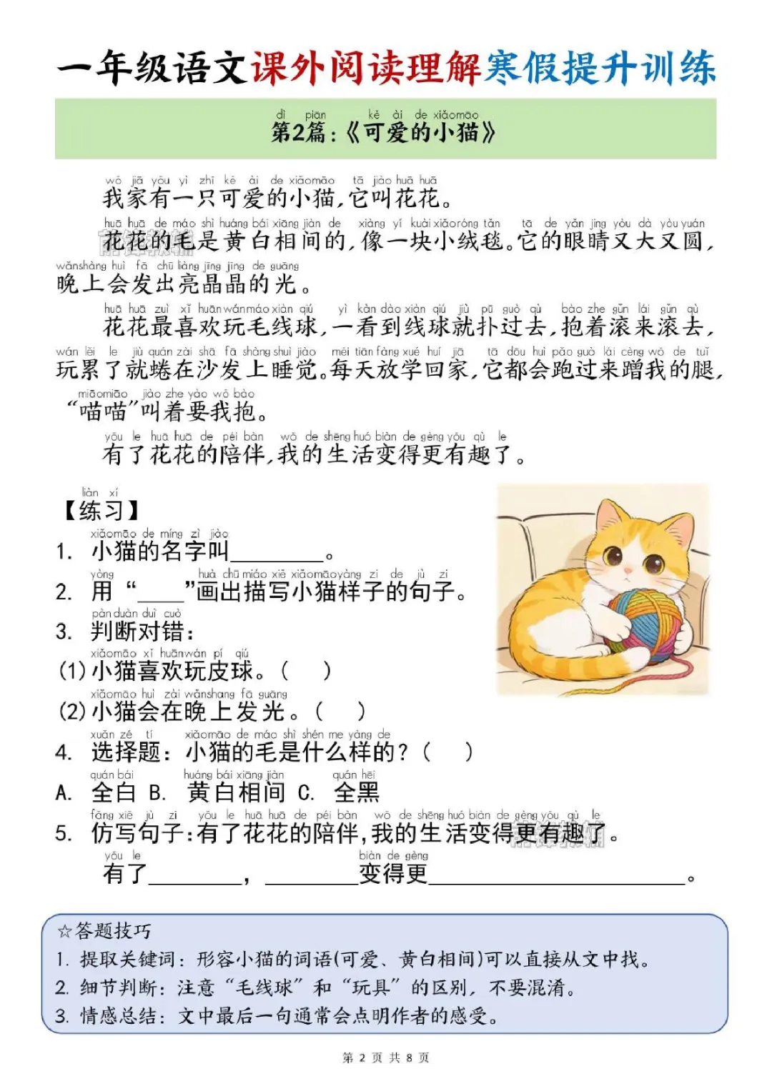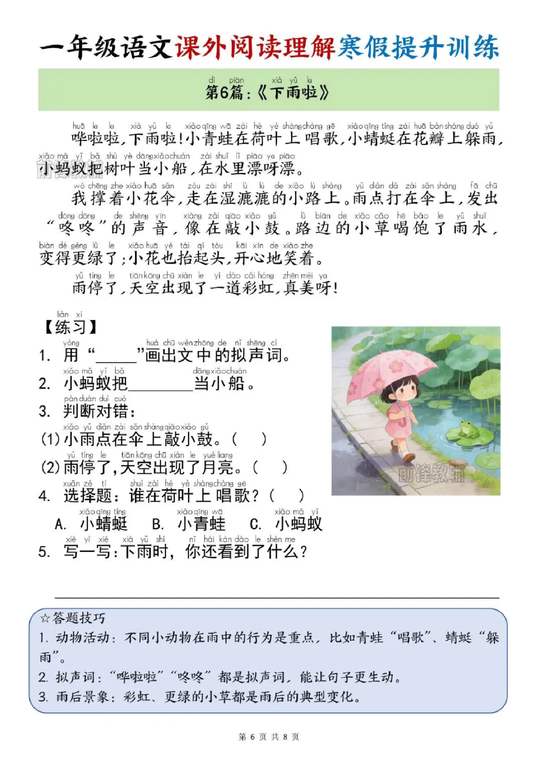 一年级语文课外阅读理解寒假提升训练(电子版可打印)