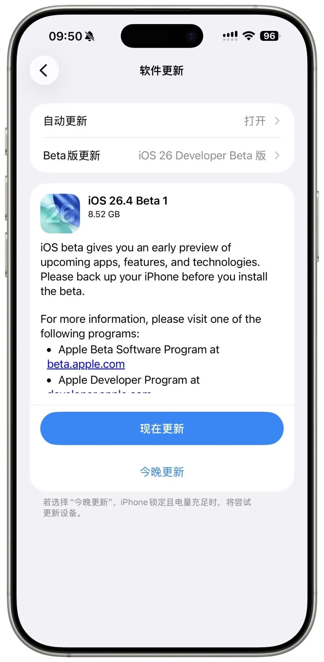 iOS 26.4 Beta 1,版本号23E5207q,说来就来。