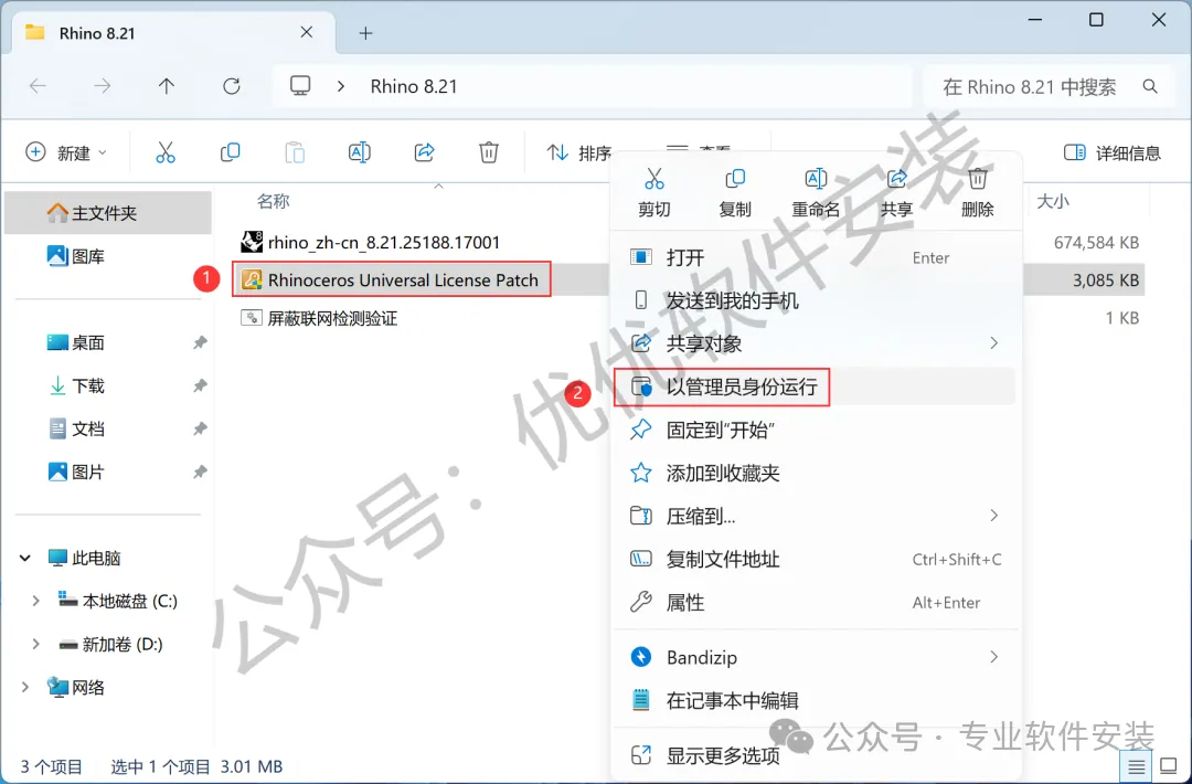 10、回到Rhino 8.21文件夹,找到【Rhinoceros…Patch】程序,右键选择【以管理员身份运行】它