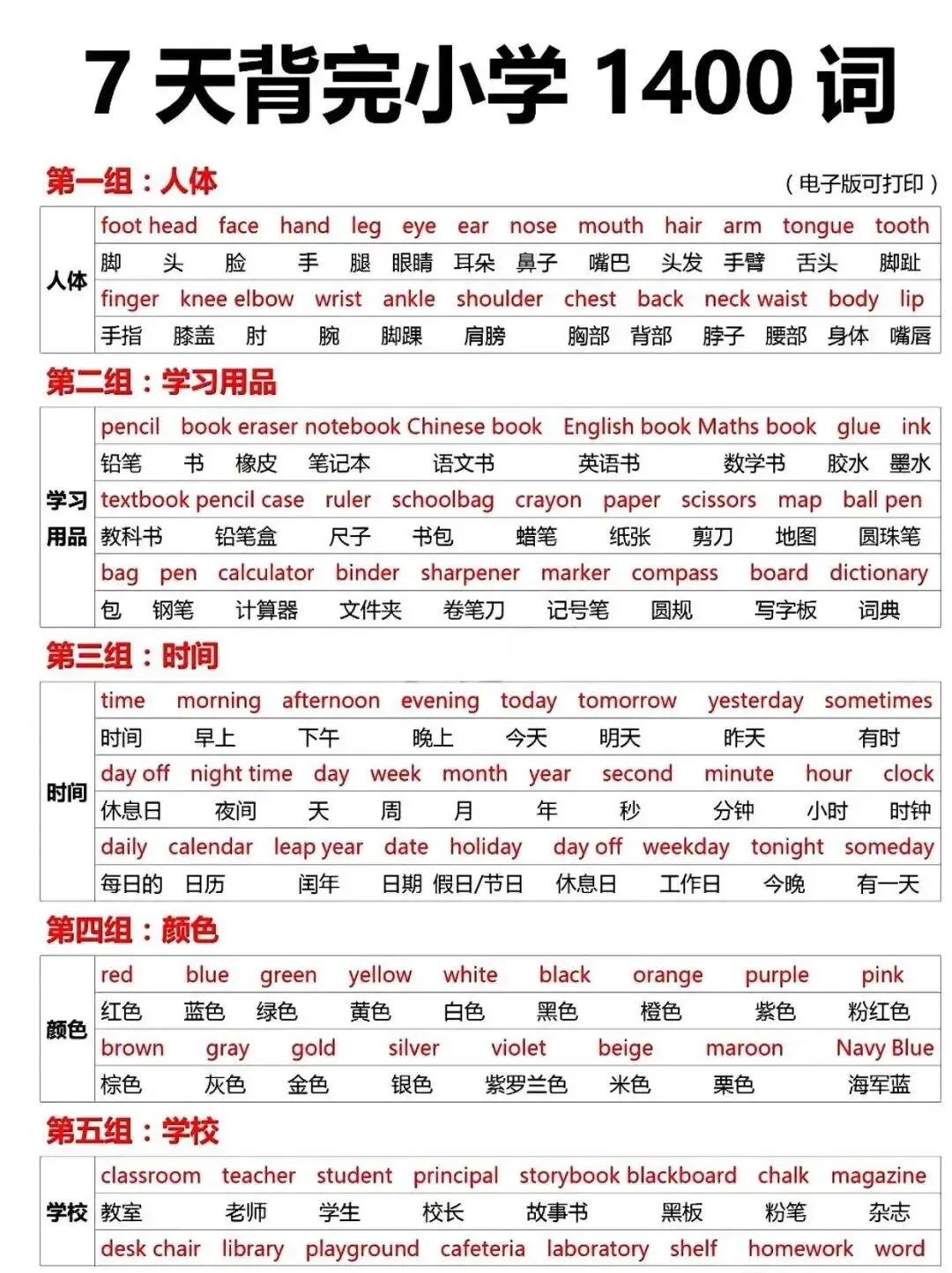 今天要分享的内容是7天背完小学1400单词,覆盖小学阶段核心 1400 个单词,贴合新课标和校内教材,不用再费心筛选词汇。依据小学生记忆规律科学规划 7 天背诵计划,将海量单词拆解为每日定量任务,难度循序渐进,还融入主题分类、自然拼读等巧记方法,告别孤立记单词的低效模式。