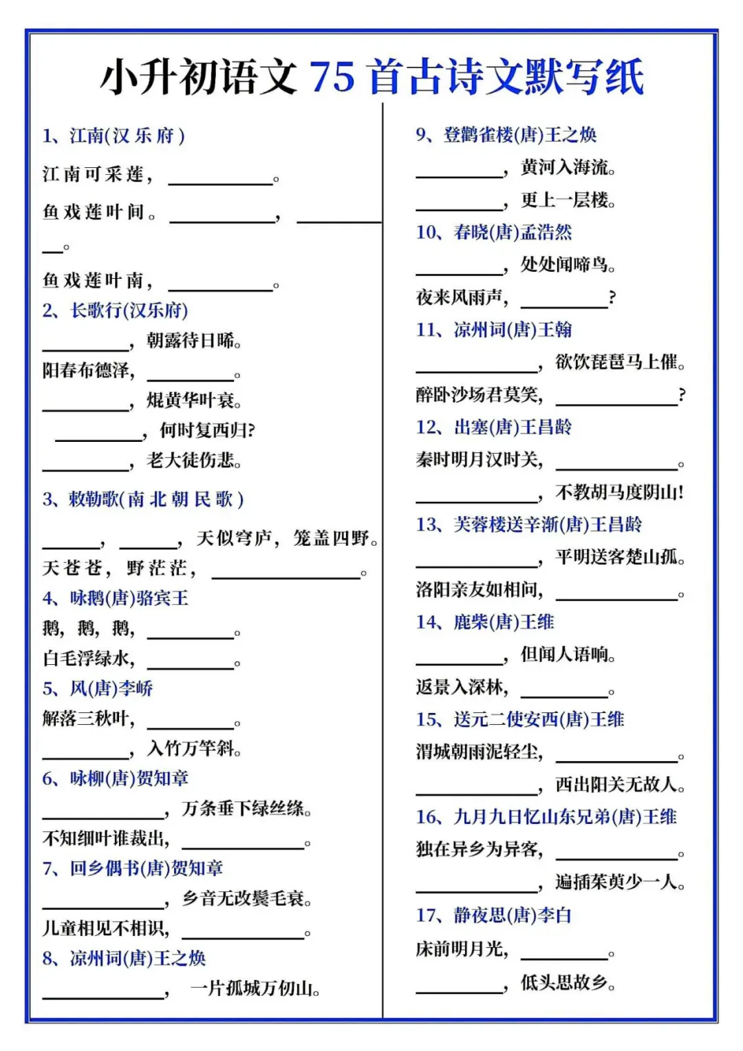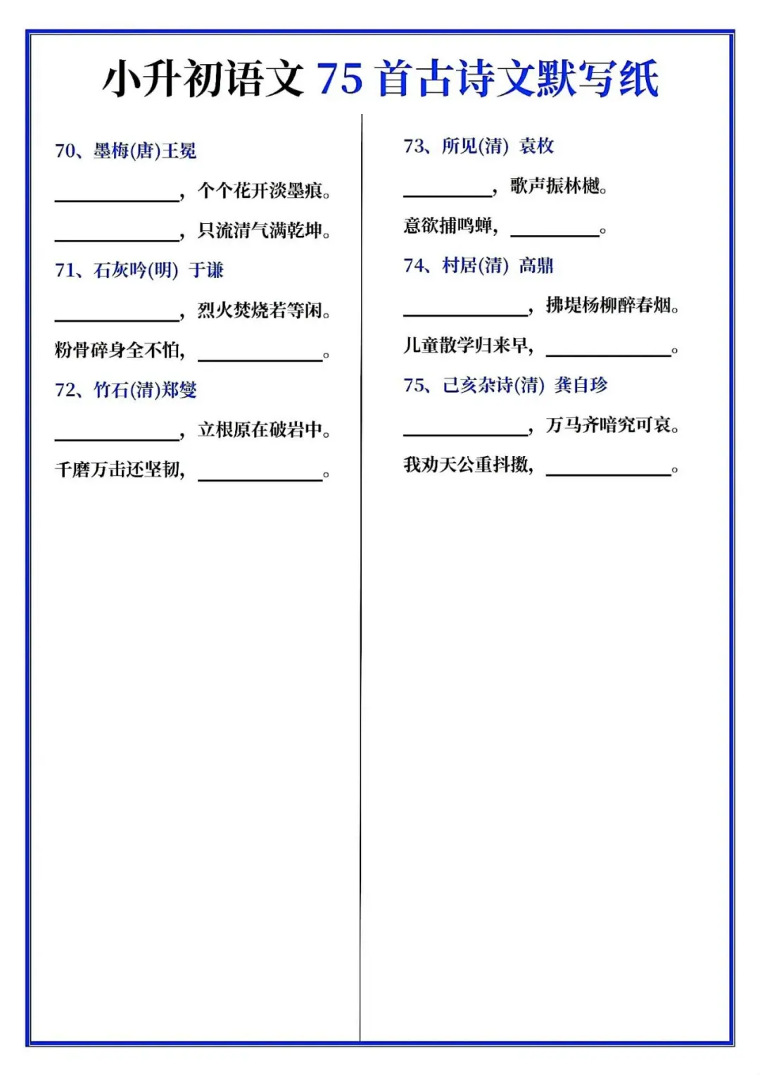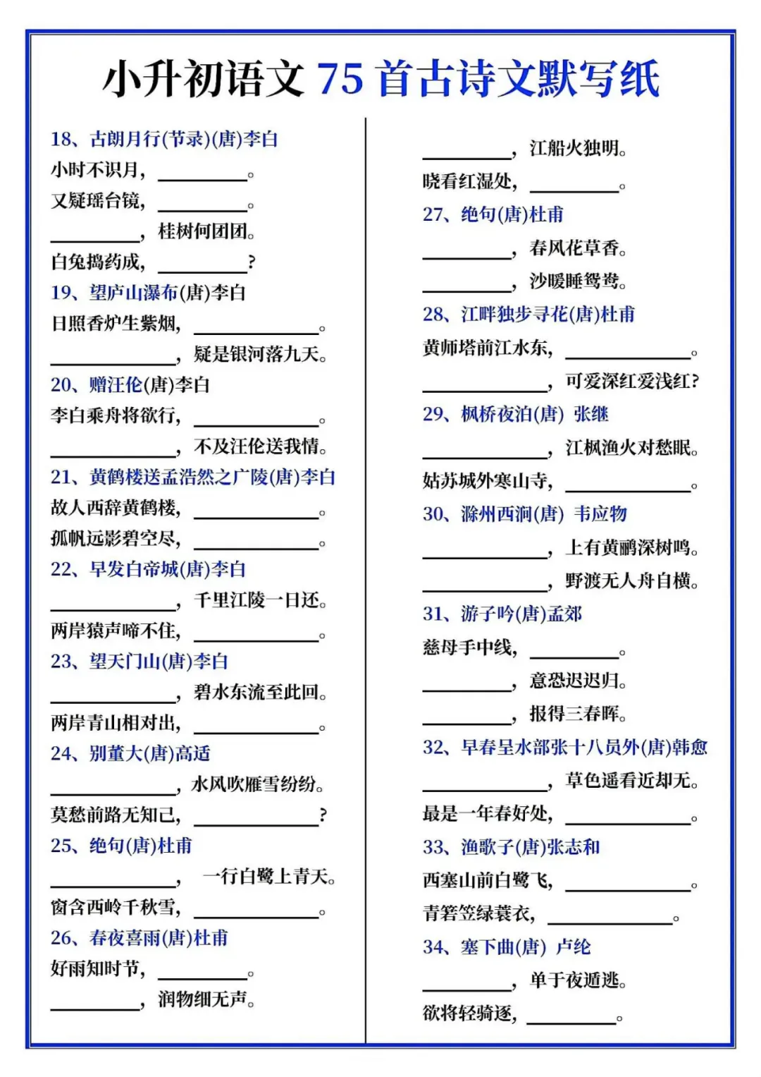 小升初语文必背《75首古诗默写纸》,可免费下载打印