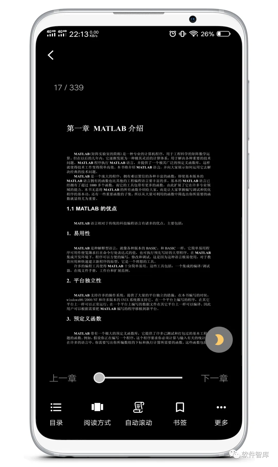 文件加载速度特别快,你可以选择横向播放或者纵向播放,可以查看目录和设置书签,还支持夜间模式,根据你的PDF 颜色是自动设置更加适合的颜色,感兴趣的朋友可以下载体验。